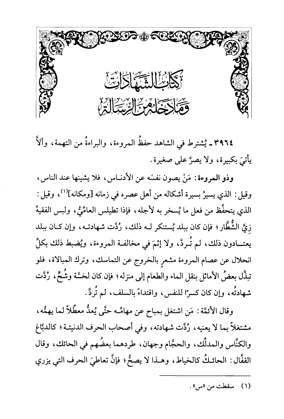3964 - يُشترط في الشاهد حفظُ المروءة، والبراءةُ من التهمة، وألَّا يأتيَ بكبيرة، ولا يصرَّ على صغيرة.