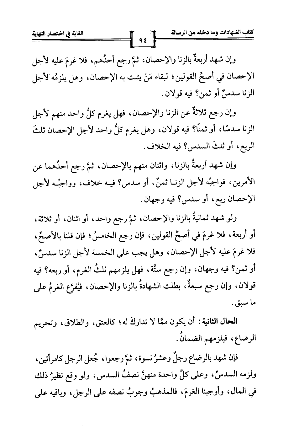 وإن شهد أربعةٌ بالزنا والإحصان، ثمَّ رجع أحدُهم، فلا غرمَ عليه لأجل الإحصان في أصحّ القولين؛ لبقاء مَنْ يثبت به الإحصان، وهل يلزمُه لأجل الزنا سدسٌ أو ثمن؟ فيه قولان.