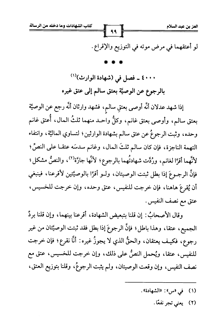 4000 - فصل في (شهادة الوارث) (¬1) بالرجوع عن الوصيَّة بعتق سالم إلى عتق غيره