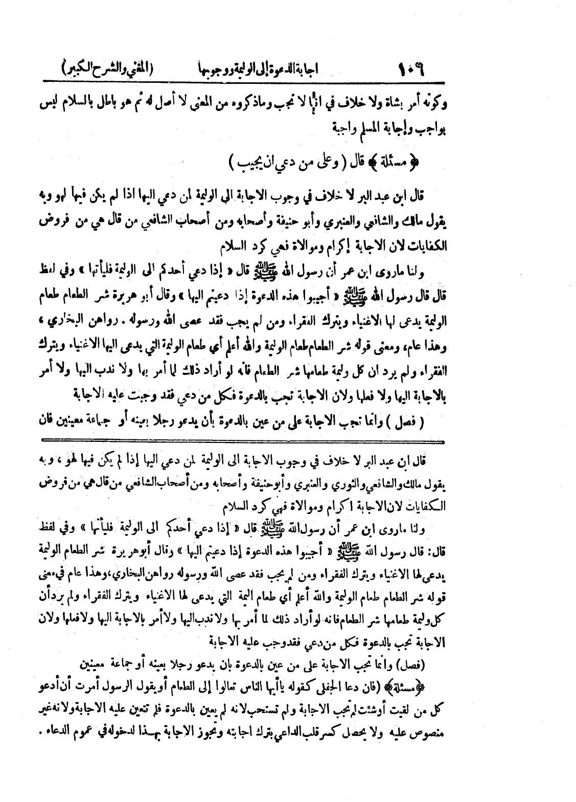 قال ابن عبد البر لا خلاف في وجوب الإجابة إلى الوليمة لمن دعي إليها إذا لم يكن فيها لهو، وبه يقول مالك والشافعي والثوري والعنبري وأبو حنيفة وأصحابه ومن أصحاب الشافعي من قال هي من فروض الكفايات لأن الإجابة اكرام وموالاة فهي كرد السلام ولنا ما روى ابن عمر أن رسول الله صلى الله عليه وسلم قال " إذا دعي أحدكم إلى الوليمة فليأتها " وفي لفظ قال: قال رسول الله صلى الله عليه وسلم " أجيبوا هذه الدعوة إذا دعيتم إليها " وقال أبو هريرة شر الطعام الوليمة يدعى لها الأغنياء ويترك الفقراء ومن لم يجب فقد عصى الله ورسوله رواهن البخاري، وهذا عام في معنى قوله شر الطعام طعام الوليمة والله أعلم أي طعام اليمة التي يدعى لها الأغنياء ويترك الفقراء ولم يرد أن كل وليمة طعامها شر الطعام فإنه لو أراد ذلك لما أمر بها ولا ندب إليها ولا أمر بالإجابة إليها ولا فعلها ولأن الإجابة تجب بالدعوة فكل من دعى فقد وجب عليه الإجابة (فصل) وإنما تجب الإجابة على من عين بالدعوة بان يدعو رجلاً بعينه أو جماعة معينين * (مسألة) * (فإن دعا الجفلى كقوله يا أيها الناس تعالوا إلى الطعام أو يقول الرسول أمرت أن أدعو كل من لقيت أو شئت لم تجب الإجابة ولم تستحب لأنه لم يعين بالدعوة فلم تتعين عليه الإجابة ولأنه غير منصوص عليه ولا يحصل كسر قلب الداعي بترك إجابته وتجوز الإجابة بهذا لدخوله في عموم الدعاء.