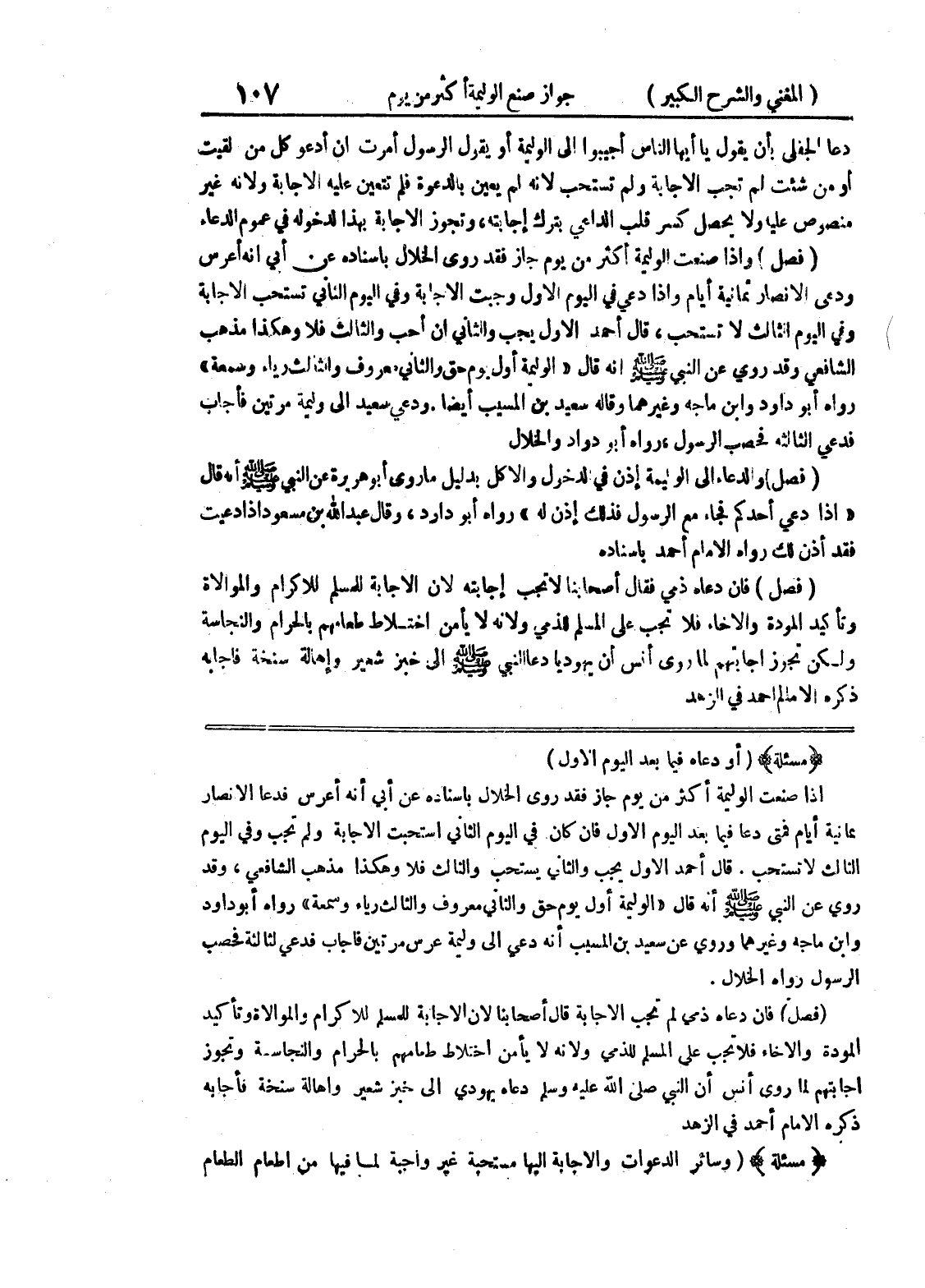 قال أحمد الاول يجب والثاني يستحب والثالث فلا وهكذا مذهب الشافعي، وقد روي عن النبي صلى الله عليه وسلم أنه قال " الوليمة أول يوم حق والثاني معروف والثالث رياء وسمعة " رواه أبو داود وابن ماجة وغيرهما وروي عن سعيد بن المسيب أنه دعي إلى وليمة عرس مرتين فأجاب فدعى لثالثة فحصب الرسول رواه الخلال.