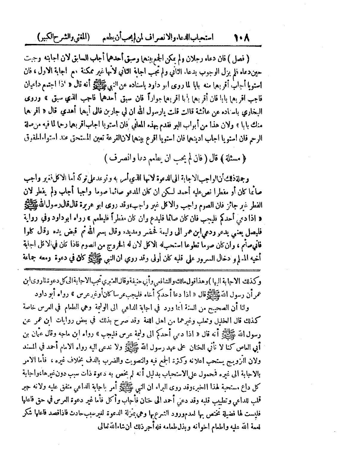 وكذلك الإجابة إليها) وهذا قول مالك والشافعي وأبي حنيفة وقال العنبري تجب الإجابة إلى كل دعوة لما روى ابن عمر أن رسول الله صلى الله عليه وسلم قال " إذا دعا أحدكم أخاه فليجب عرسا كان أو غير عرس " رواه أبو داود ولنا أن الصحيح من السنة إنما ورد في إجابة الداعي إلى الوليمة وهي الطعام في العرس خاصة كذلك قال الخليل وثعلب وغيرهما من أهل اللغة وقد صرح بذلك في بعض روايات ابن عمر عن رسول الله صلى الله عليه وسلم أنه قال " إذا دعي أحدكم إلى وليمة عرس فليجب " رواه ابن ماجه وقال عثمان بن أبي العاص كنا لا نأتي الختان على عهد رسول الله صلى الله عليه وسلم ولا ندعى إليه رواه الإمام أحمد في المسند ولأن التزويج يستحب إعلانه وكثرة الجمع فيه والتصويت والضرب بالدف بخلاف غيره، فأما الأمر بالإجابة إلى غيره فمحمول على الاستحباب بدليل أنه لم يخص به دعوة ذات سبب دون غيرها، وإجابة كل داع مستحبة لهذا الخبر، وقد روى البراء أن النبي صلى الله عليه وسلم أمر باجابة الداعي متفق عليه ولأنه جبر قلب للداعي وتطييب قلبه وقد دعي أحمد إلى ختان فأجاب وأكل فأما غير دعوة العرس في حق فاعلها فليست لها فضيلة تختص بها لعدم ورود الشرع بها وهي بمنزلة الدعوة لغير سبب حادث فإذا قصد فاعلها شكر نعمة الله عليه وإطعام إخوانه وبذل طعامه فله أجر ذلك إن شاء الله تعالى