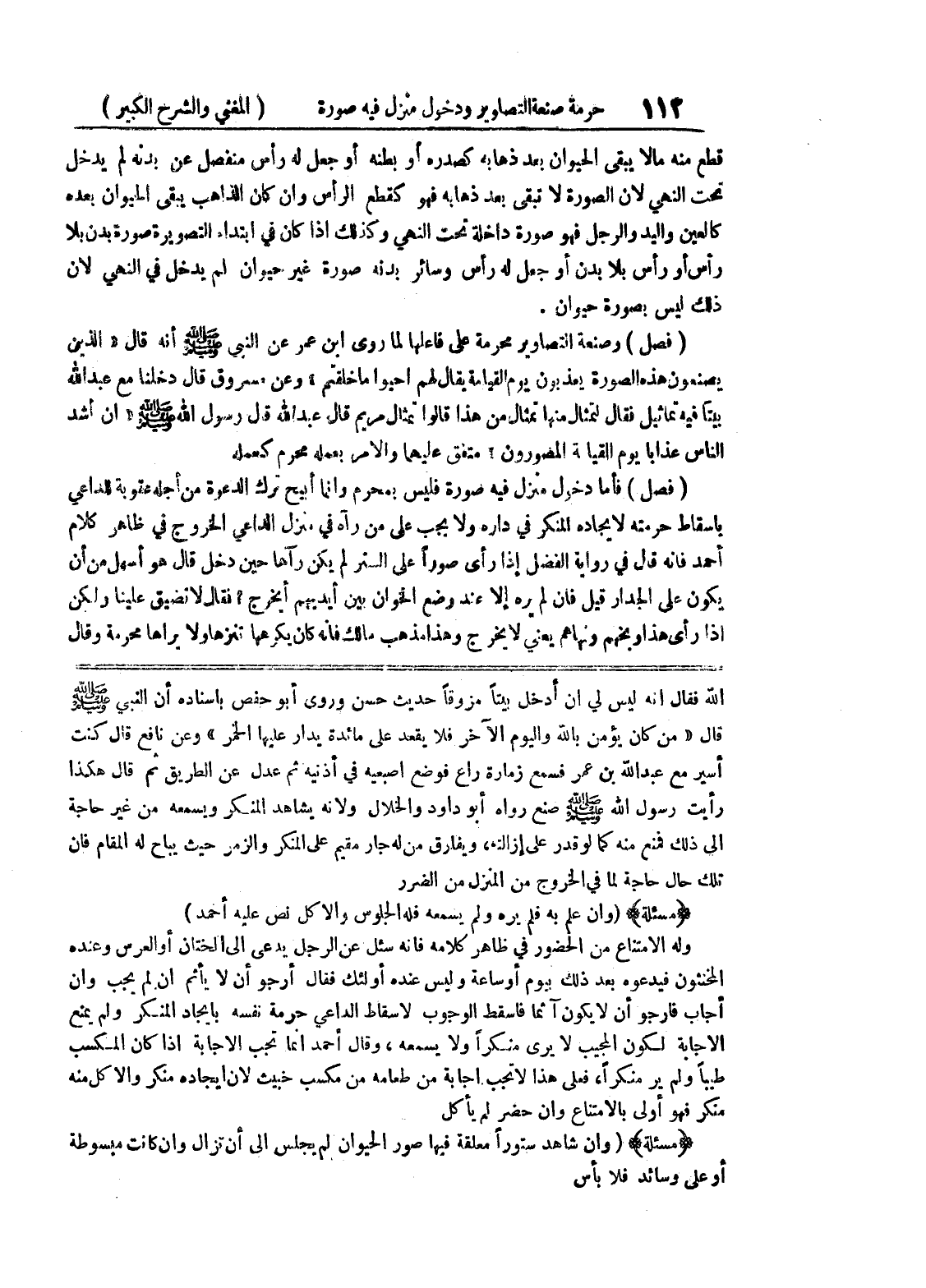 إلى ذلك فمنع منه كما لو قدر على إزالته، ويفارق من له جار مقيم على المنكر والزمر حيث يباح له المقام فإن تلك حال حاجة لما في الخروج من المنزل من الضرر * (مسألة) * (وإن علم به فلم يره ولم يسمعه فله الجلوس والأكل نص عليه أحمد) وله الامتناع من الحضور في ظاهر كلامه فإنه سئل عن الرجل يدعى إلى الختان أو العرس وعنده المخنثون فيدعوه بعد ذلك بيوم أو ساعة وليس عنده أولئك فقال أرجو أن لا يأثم إن لم يجب وإن أجاب فارجو أن لا يكون آثما فاسقط الوجوب لإسقاط الداعي حرمة نفسه بإيجاد المنكر ولم يمنع الإجابة لكون المجيب لا يرى منكراً ولا يسمعه، وقال أحمد إنما تجب الإجابة إذا كان المكسب طيباً ولم ير منكراً، فعلى هذا لا تجب إجابة من طعامه من مكسب خبيث لأن إيجاده منكر والأكل منه منكر فهو أولى بالامتناع وإن حضر لم يأكل * (مسألة) * (وإن شاهد ستوراً معلقة فيها صور الحيوان لم يجلس إلى أن تزال وإن كانت مبسوطة أو على وسائد فلا بأس
