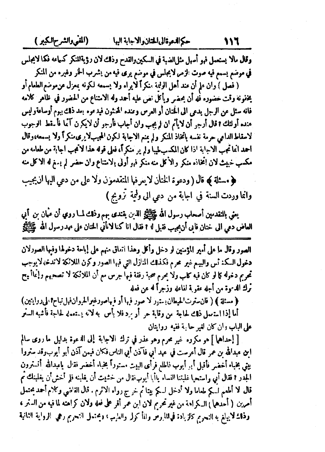 الصور وقال ما على أمير المؤمنين لو دخل وأكل وهذا اتفاق منهم على إباحة دخولها وفيها الصور لأن دخول الكنائس والبيع غير محرم فكذلك المنازل التي فيها الصور وكون الملائكة لا تدخله لا يوجب تحريم دخوله كما لو كان فيه كلب ولا يحرم صحبة رفقة فيها جرس مع إن الملائكة لا تصحبهم وإنما أبيح ترك الدعوة من أجله عقوبة لفاعله وزجراً له عن فعله * (مسألة) * (فإن سترت الحيطان بستور لا صور فيها أو فيها صور غير الحيوان فهل تباح؟ على روايتين) أما إذا استعمل ذلك لحاجة من وقاية حر أو برد فلا بأس به لأنه يستعمله لحاجة فأشبه الستر على الباب وإن كان لغير حاجة ففيه روايتان [إحداهما] هو مكروه غير محرم وهو عذر في ترك الإجابة إلى الدعوة بدليل ما روى سالم ابن عبد الله بن عمر قال أعرست في عهد أبي فآذن أبي الناس فكان فيمن آذن أبو أيوب وقد ستروا بيتي بخباء أخضر فأقبل أبو أيوب فاطلع فرأى البيت مستوراً بخباء أخضر فقال يا عبد الله أتسترون الجدر؟ فقال أبي واستحيا غلبتنا النساء يا أبا أيوب فقال من خشيت أن يغلبنه فلم أخش أن يغلبنك ثم قال لا أطعم لكم طعاماً ولا أدخل لكم بيتاً ثم خرج رواه الأثرم.