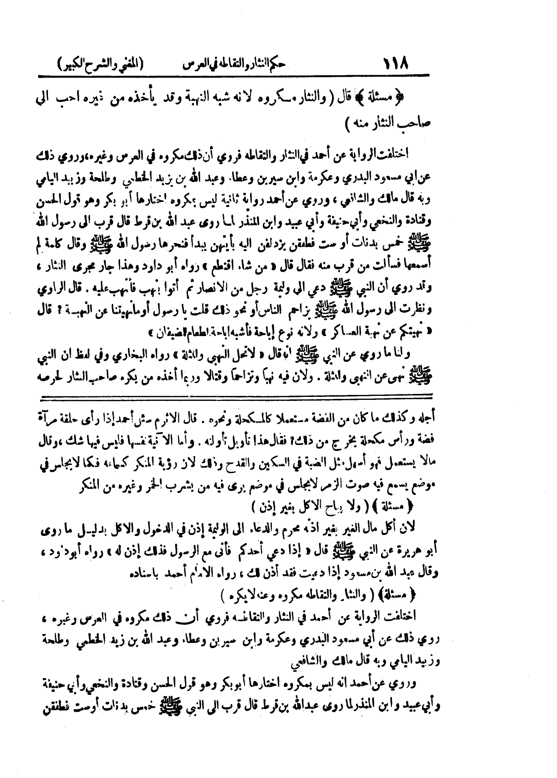 * (مسألة) * (ولا يباح الاكل لغير إذن) لأن أكل مال الغير بغير إذنه محرم والدعاء إلى الوليمة إذن في الدخول والأكل بدليل ما روى أبو هريرة عن النبي صلى الله عليه وسلم قال " إذا دعي أحدكم فأتى مع الرسول فذلك إذن له " رواه أبو داود، وقال عبد الله بن مسعود إذا دعيت فقد أذن لك، رواه الإمام أحمد بإسناده * (مسألة) * (والنثار والتقاطه مكروه وعنه لا يكره) اختلفت الرواية عن أحمد في النثار والتقاطه فروي أن ذلك مكروه في العرس وغيره، روى ذلك عن أبي مسعود البدري وعكرمة وابن سيرين وعطاء وعبد الله بن زيد الخطمي وطلحة وزبيد اليامي وبه قال مالك والشافعي وروى عن أحمد أنه ليس بمكروه اختارها أبو بكر وهو قول الحسن وقتادة والنخعي وأبي حنيفة وأبي عبيد وابن المنذر لما روى عبد الله بن قرط قال قرب إلى النبي صلى الله عليه وسلم خمس بدنات أو ست فطفقن