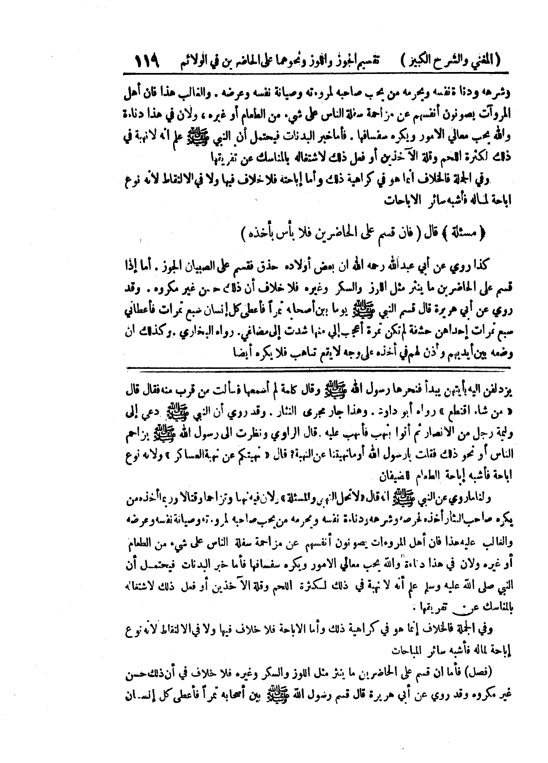 وفي الجملة فالخلاف إنما هو في كراهية ذلك وأما الإباحة فلا خلاف فيها ولا في الالتقاط لأنه نوع إباحة لماله فأشبه سائر المباحات (فصل) فأما إن قسم على الحاضرين ما ينثر مثل اللوز والسكر وغيره فلا خلاف في أن ذلك حسن غير مكروه وقد روي عن أبي هريرة قال قسم رسول الله صلى الله عليه وسلم بين أصحابه تمراً فأعطى كل إنسان