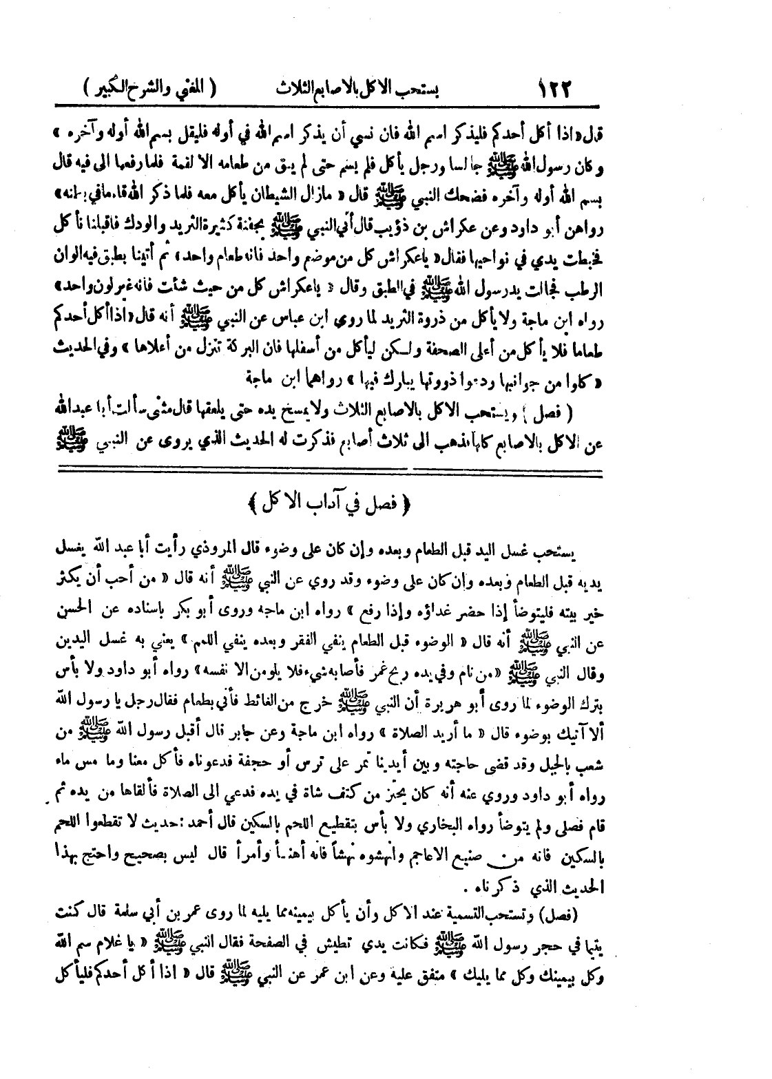 * (فصل في آداب الاكل) * يستحب غسل اليد قبل الطعام وبعده وان كان على وضوء قال المروذي رأيت أبا عبد الله يغسل يديه قبل الطعام وبعده وان كان على وضوء وقد روي عن النبي صلى الله عليه وسلم أنه قال " من أحب أن يكثر خير بيته فليتوضأ إذا حضر غداؤه وإذا رفع " رواه ابن ماجه وروى أبو بكر باسناده عن الحسن عن النبي صلى الله عليه وسلم أنه قال " الوضوء قبل الطعام ينفي الفقر وبعده ينفي اللمم " يعني به غسل اليدين وقال النبي صلى الله عليه وسلم " من نام وفي يده ربح غمر فأصابه شئ فلا يلومن إلا نفسه " رواه أبو داود ولا بأس بترك الوضوء لما روى أبو هريرة أن النبي صلى الله عليه وسلم خرج من الغائط فأني بطعام فقال رجل يا رسول الله ألا آتيك بوضوء قال " ما أريد الصلاة " رواه ابن ماجه وعن جابر قال أقبل رسول الله صلى الله عليه وسلم من شعب بالجبل وقد قضى حاجته وبين أيدينا تمر على ترس أو حجفة فدعوناه فأكل معنا وما مس ماء