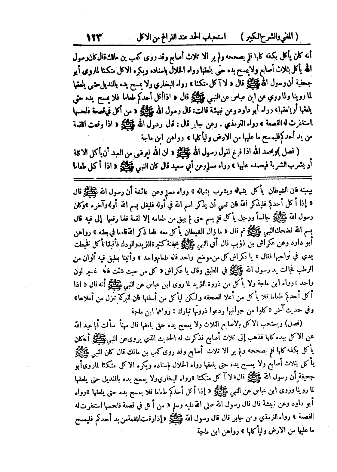 بيمينه فإن الشيطان يأكل بشماله ويشرب بشماله " رواه مسلم وعن عائشة أن رسول الله صلى الله عليه وسلم قال " إذا أكل أحدكم فليذكر الله فإن نسي أن يذكر اسم الله في أوله فليقل بسم الله أوله وآخره " وكان رسول الله صلى الله عليه وسلم جالساً ورجل يأكل فلم يسم حتى لم يبق من طعامه إلا لقمة فلما رفعها إلى فيمن قال بسم الله فضحك النبي صلى الله عليه وسلم ثم قال " ما زال الشيطان يأكل معه فلما ذكر الله قاءما في بطنه " رواهن أبو داود وعن عكراش بن ذؤيب قال أتى النبي صلى الله عليه وسلم بجفنة كثيرة الثريد والودك فأقبلنا نأكل فخبطت يدي في نواحيها فقال " يا عكراش كل من موضع واحد فإنه طعام واحد " وأتينا بطبق فيه ألوان من الرطب فجالت يد رسول الله صلى الله عليه وسلم في الطبق وقال يا عكراش " كل من حيث شئت فإنه غير لون واحد " رواه ابن ماجه ولا يأكل من ذروه الثريد لما روى ابن عباس عن النبي صلى الله عليه وسلم أنه قال " إذا أكل أحدكم طعاماً فلا يأكل من أعلا الصحفة ولكن ليأكل من أسفلها فإن البركة تنزل من أعلاها " وفي حديث آخر " كلوا من جوانبها ودعوا ذروتها تبارك " رواهما ابن ماجة (فصل) ويستحب الأكل بالأصابع الثلاث ولا يمسح يده حق يلعقها قال مهنا سألت أبا عبد الله عن الأكل بيده كلها فذهب إلى ثلاث أصابع فذكرت له الحديث الذي يروى عن النبي صلى الله عليه وسلم أنه كان يأكل بكفه كلها فلم يصححه ولم ير إلا ثلاث أصابع وقد روى كعب بن مالك قال كان النبي صلى الله عليه وسلم يأكل بثلاث أصابع ولا يمسح يده حتى يلعقها رواه الخلال باسناده ويكره الأكل متكئاً لما روى أبو