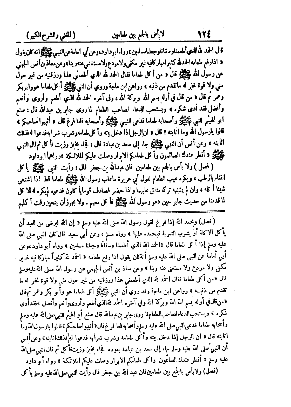 (فصل) ويحمد الله إذا فرغ لقول رسول الله صلى الله عليه وسلم " ان الله ليرضى من العبد أن يأكل الأكلة أو يشرب الشربة فيحمده عليها " رواه مسلم، وعن أبي سعيد قال كان النبي صلى الله عليه وسلم إذا أكل طعاما قال " الحمد الله الذي أطعمنا وسقانا وجعلنا مسلمين " رواه أبو داود، وعن أبي أمامة عن النبي صلى الله عليه وسلم أنه كان يقول إذا رفع طعامه " الحمد لله كثيراً مباركاً فيه غير مكفى ولا مودع ولا مستغنى عنه ربنا " وعن معاذ بن أنس الجهمي عن رسول الله صلى الله عليه وسلم قال " من أكل طعاماً فقال الحمد لله الذي أطعمني هذا ورزقنيه من غير حول مني ولا قوة غفر له ما تقدم من ذنبه " رواهن ابن ماجة وقد روي أن النبي صلى الله عليه وسلم أكل طعاماً هو وأبو بكر وعمر ثم قال " من قال في أوله بسم الله الله وبركة الله وفي آخره الحمد لله الذي أطعم وأروى وأنعم وأفضل " فقد أدى شكره " ويستحب الدعاء لصاحب الطعام لما روى جابر بن عبد الله قال صنع أبو الهيثم للنبي صلى الله عليه وسلم وأصحابه طعاما فدعى النبي صلى الله عليه وسلم وأصحابه فلما فرغ قال " أثيبوا صاحبكم " قالوا يا رسول الله وما إثابته قال " إن الرجل إذا دخل بينه وأكل طعامه وشرب شرابه فدعوا له فذلك اثابته " وعن أنس أن النبي صلى الله عليه وسلم جاء إلى سعد بن عبادة يعوده فجاء بخبز وزيت فأكل ثم قال النبي صلى الله عليه وسلم " أفطر عندك الصائمون وأكل طعامكم الأبرار وصلت عليكم الملائكة " رواه أبو داود (فصل) ولا بأس بالجمع بين طعامين فإن عبد الله بن جعفر قال رأيت النبي صلى الله عليه وسلم يأكل