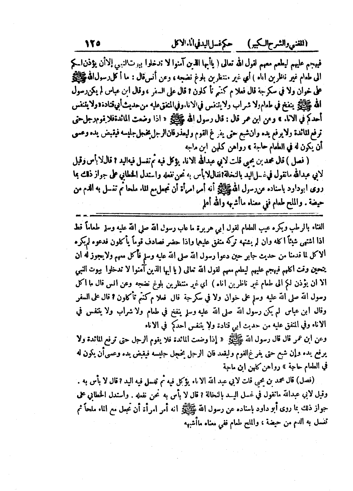 إذا اشتهى شيئاً أكله وإن لم يشتهه تركه متفق عليهما وإذا حضر فصادف قوماً يأكلون فدعوه لم يكره الأكل لما قدمنا من حديث جابر حين دعوا رسول الله صلى الله عليه وسلم فأكل معهم ولا يجوز له أن يتحين وقت أكلهم فيهجم عليهم ليطعم معهم لقول الله تعالى (يا أيها الذين آمنوا لا تدخلوا بيوت النبي إلا أن يؤذن لكم إلى طعام غير ناظرين إناه) أي غير منتظرين بلوغ نضجه وعن أنس قال ما أكل رسول الله صلى الله عليه وسلم على خوان ولا في سكرجة قال فعلام كنتم تأكلون؟ قال على السفر وقال ابن عباس لم يكن رسول الله صلى الله عليه وسلم ينفخ في طعام ولا شراب ولا يتنفس في الإناء وفي المتفق عليه من حديث أبي قتادة ولا يتنفس أحدكم في الاناء وعن ابن عمر قال قال رسول الله صلى الله عليه وسلم " إذا وضعت المائدة فلا يقوم الرجل حتى ترفع المائدة ولا يرفع يده وإن شبع حتى يفرغ القوم وليقعد فإن الرجل يخجل جليسه فيقبض يده وعسى أن يكون له في الطعام حاجة " رواهن كلهن ابن ماجة (فصل) قال محمد بن يحيى قلت لأبي عبد الله الإناء يؤكل فيه ثم تغسل فيه اليد؟ قال لا بأس به.