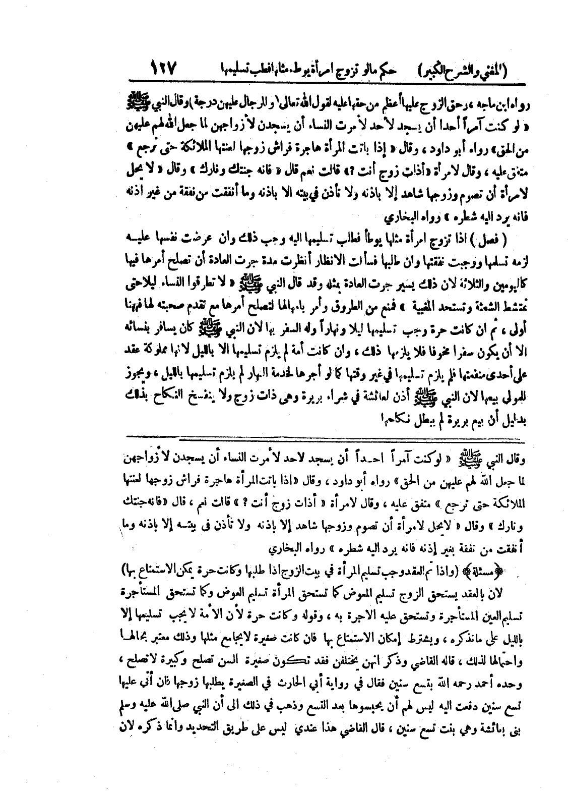 وقال النبي صلى الله عليه وسلم " لو كنت آمراً أحداً أن يسجد لأحد لأمرت النساء أن يسجدن لأزواجهن لما جعل الله لهم عليهن من الحق " رواه أبو داود، وقال " إذا باتت المرأة هاجرة فراش زوجها لعنتها الملائكة حتى ترجع " متفق عليه، وقال لامرأة " أذات زوج انت؟ " قالت نعم، قال " فإنه جنتك ونارك " وقال " لا يحل لامرأة أن تصوم وزوجها شاهد إلا بإذنه ولا تأذن في بيته إلا بإذنه وما أنفقت من نفقة بغير إذنه فإنه يرد إليه شطره " رواه البخاري * (مسألة) * (وإذا تم العقد وجب تسليم المرأة في بيت الزوج إذا طلبها وكانت حرة يمكن الاستمتاع بها) لأن بالعقد يستحق الزوج تسليم المعوض كما تستحق المرأة تسليم العوض وكما تستحق المستأجرة تسليم العين المستأجرة وتستحق عليه الاجرة به، وقوله وكانت حرة لأن الأمة لا يجب تسليمها إلا بالليل على ما نذكره، ويشترط إمكان الاستمتاع بها فإن كانت صغيرة لا يجامع مثلها وذلك معتبر بحالها واحتمالها لذلك، قاله القاضي وذكر انهن يختلفن فقد تكون صغيرة السن تصلح وكبيرة لا تصلح، وحده أحمد رحمه الله بتسع سنين فقال في رواية أبي الحارث في الصغيرة يطلبها زوجها فإن أتى عليها تسع سنين دفعت إليه ليس لهم أن يحبسوها بعد التسع وذهب في ذلك إلى أن النبي صلى الله عليه وسلم بنى بعائشة وهي بنت تسع سنين، قال القاضي هذا عندي ليس على طريق التحديد وإنما ذكره لأن