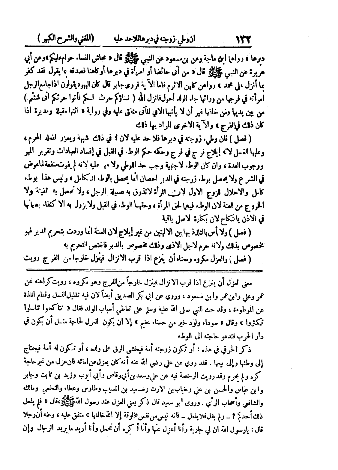 معنى العزل أن ينزع إذا قرب الإنزال فينزل خارجاً من الفرج وهو مكروه، رويت كراهته عن عمر وعلي وابن عمر وابن مسعود، وروي عن أبي بكر الصديق أيضاً لأن فيه تقليل النسل وقطع اللذة عن الموطوءة، وقد حث النبي صلى الله عليه وسلم على تعاطي أسباب الولد فقال " تناكحوا تناسلوا تكثروا " وقال " سوداء ولود خير من حسناء عقيم " إلا أن يكون العزل لحاجة مثل أن يكون في دار الحرب فتدعو حاجته إلى الوطئ ذكر الخرقي في هذه: أو تكون زوجته أمة فيخشى الرق على ولده، أو تكون له أمة فيحتاج الى وطئها والى بيعها.