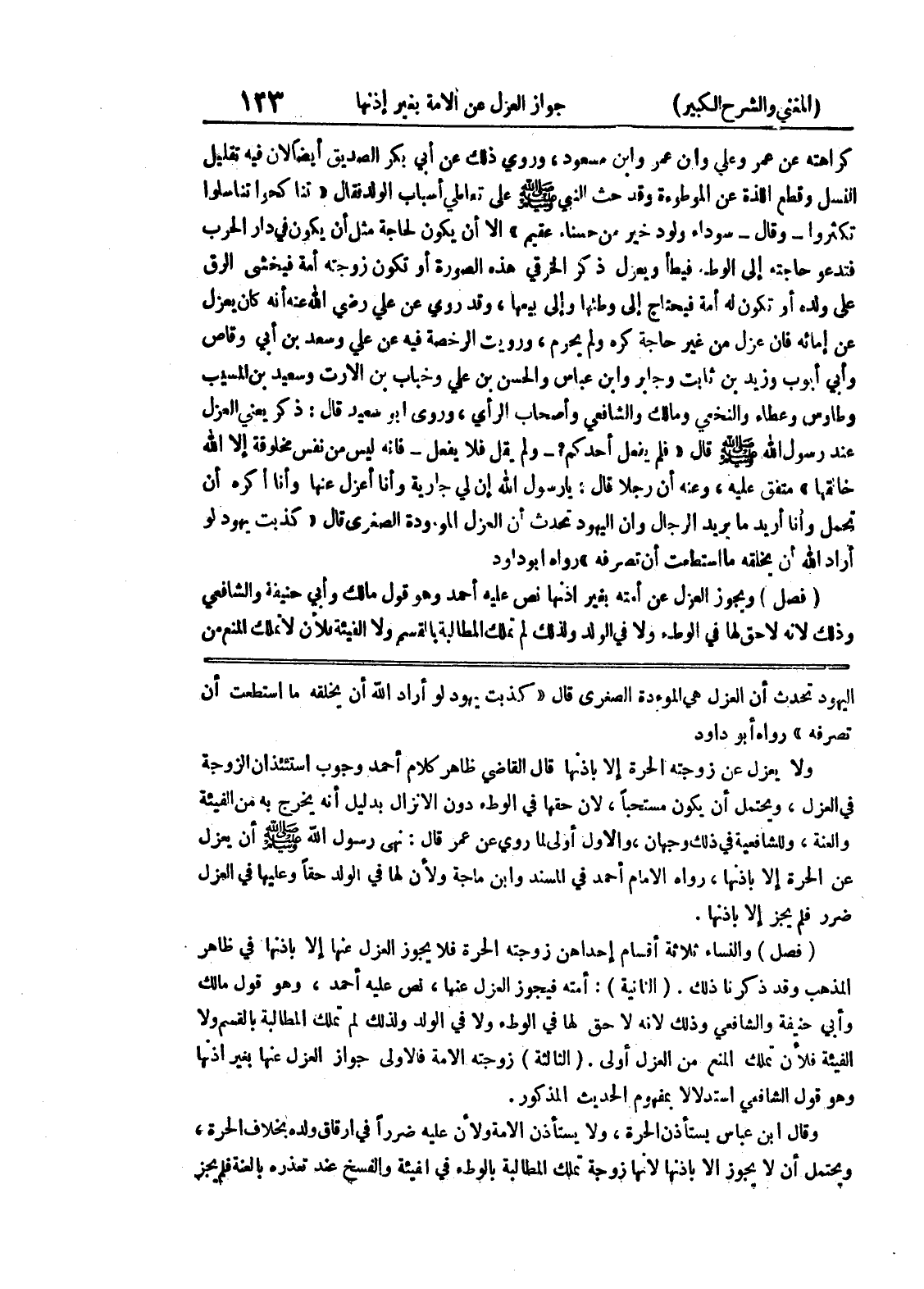 (الثانية) : أمته فيجوز العزل عنها، نص عليه أحمد، وهو قول مالك وأبي حنيفة والشافعي وذلك لأنه لا حق لها في الوطئ ولا في الولد ولذلك لم تملك المطالبة بالقسم ولا الفيئة فلأن تملك المنع من العزل أولى.