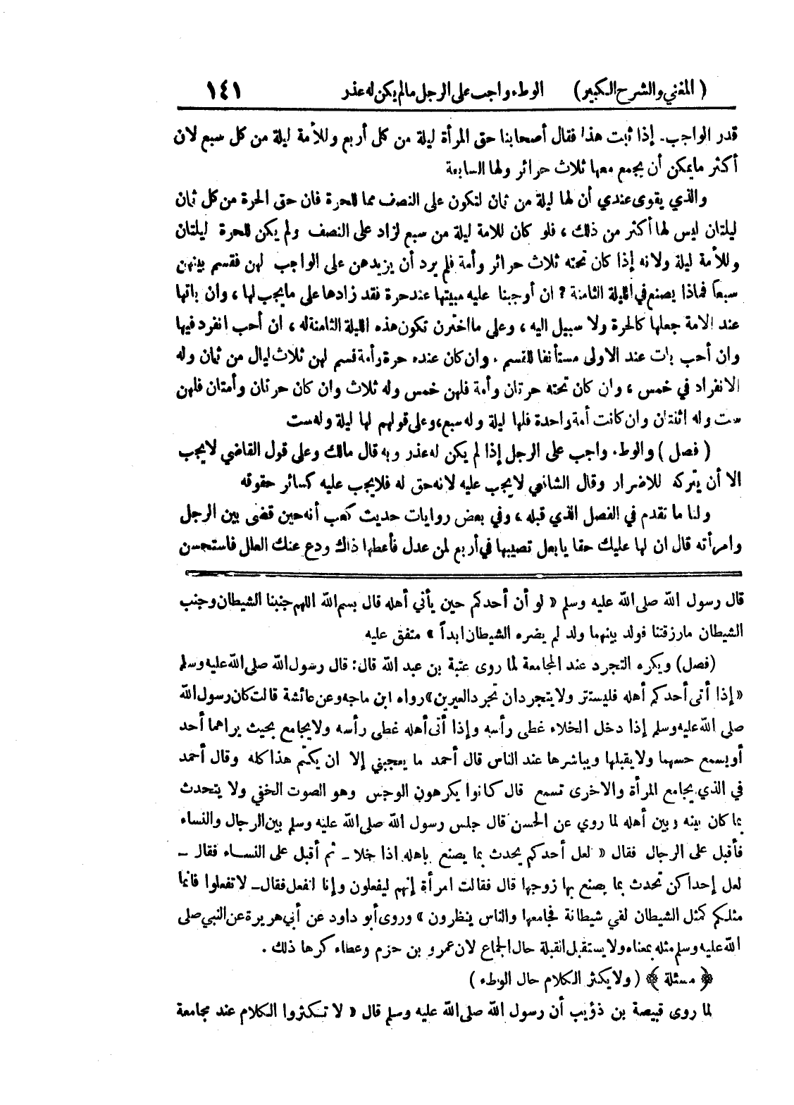 قال رسول الله صلى الله عليه وسلم " لو أن أحدكم حين يأتي أهله قال بسم الله اللهم جنبنا الشيطان وجنب الشيطان ما رزقتنا فولد بينهما ولد لم يضره الشيطان أبداً " متفق عليه (فصل) ويكره التجرد عند المجامعة لما روى عتبة بن عبد الله قال: قال رسول الله صلى الله عليه وسلم " إذا أتى أحدكم أهله فليستتر ولا يتجردان تجرد العيرين " رواه ابن ماجه وعن عائشة قالت كان رسول الله صلى الله عليه وسلم إذا دخل الخلاء غطى رأسه وإذا أتى أهله غطى رأسه ولا يجامع بحيث يراهما أحد أو يسمع حسهما ولا يقبلها ويباشرها عند الناس قال احمد ما يعجبني إلا أن يكتم هذا كله وقال أحمد في الذي يجامع المرأة والأخرى تسمع قال كانوا يكرهون الوجس وهو الصوت الخفي ولا يتحدث بما كان بينه وبين أهله لما روي عن الحسن قال جلس رسول الله صلى الله عليه وسلم بين الرجال والنساء فأقبل على الرجال فقال " لعل أحدكم يحدث بما يصنع بأهله إذا خلا - ثم أقبل على النساء فقال - لعل إحداكن تحدث بما يصنع بها زوجها قال فقالت امرأة إنهم ليفعلون وإنا لنفعل فقال - لا تفعلوا فإنما