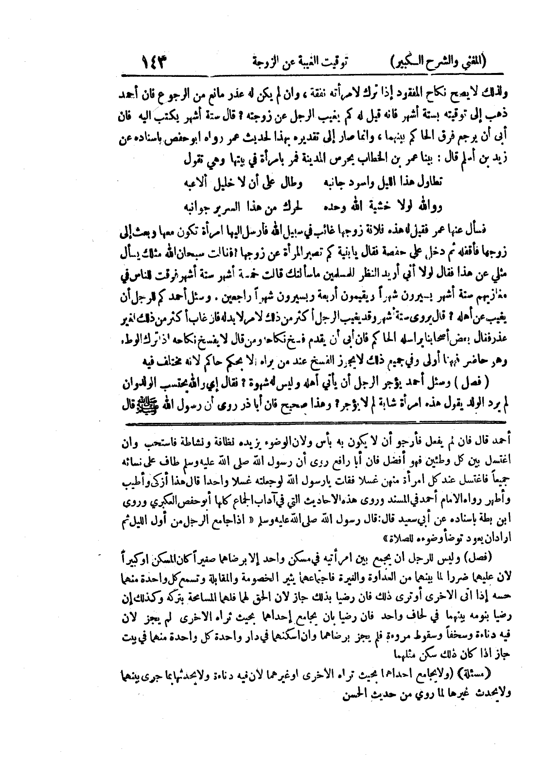 جميعاً فاغتسل عند كل امرأة منهن غسلا فقلت يا رسول الله لو جعلته غسلا واحدا قال هذا أزكى وأطيب وأطهر رواه الإمام أحمد في المسند وروى هذه الأحاديث التي في آداب الجماع كلها أبو حفص العكبري وروى ابن بطة بإسناده عن أبي سعيد قال: قال رسول الله صلى الله عليه وسلم " إذا جامع الرجل من أول الليل ثم أراد أن يعود توضأ وضوءه للصلاة " (فصل) وليس للرجل أن يجمع بين امرأتيه في مسكن واحد إلا برضاهما صغيراً كان المسكن أو كبيراً لأن عليهما ضرراً لما بينهما من العداوة والغيرة فاجتماعهما يثير الخصومة والمقابلة وتسمع كل واحدة منهما حسه إذا أتى الأخرى أو ترى ذلك فإن رضيا بذلك جاز لأن الحق لهما فلهما المسامحة بتركه وكذلك إن رضيا بنومه بينهما في لحاف واحد فإن رضيا بأن يجامع إحداهما بحيث ثراه الأخرى لم يجز لأن فيه دناءة وسخفا وسقوط مروءة فلم يجز برضاهما وإن اسكنهما في دار واحدة كل واحدة منهما في بيت جاز إذا كان ذلك سكن مثلهما * (مسألة) * (ولا يجامع إحداهما بحيث تراه الأخرى أو غيرهما لأن فيه دناءة ولا يحدثها بما جرى بينهما ولا يحدث غيرها لما روي من حديث الحسن