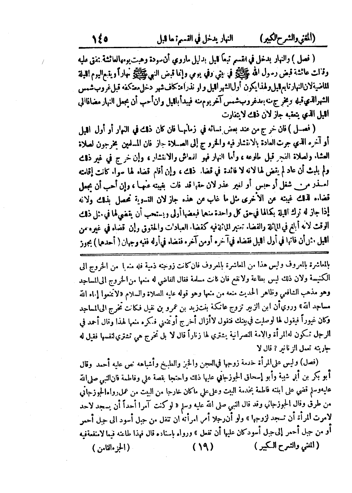 بالمعاشرة بالمعروف وليس هذا من المعاشرة بالمعروف فإن كانت زوجته ذمية فله منعها من الخروج إلى الكنيسة ولأن ذلك ليس بطاعة ولا نفع فإن كانت مسلمة فقال القاضي له منعها من الخروج إلى المساجد وهو مذهب الشافعي وظاهر الحديث منعه من منعها وهو قوله عليه الصلاة والسلام " لا تمنعوا إماء الله مساجد الله " وروي أن ابن الزبير تزوج عاتكة بنت زيد بن عمرو بن نفيل فكانت تخرج الى المساجد وكان غيوراً فيقول لها لو صليت في بيتك فتقول لا أزال أخرج أو تمنعني فكره منعها لهذا وقال أحمد في الرجل تكون له المرأة والأمة النصرانية يشتري لها زناراً قال لا بل تخرج هي تشتري لنفسها فقيل له جاريته تعمل الزنانير؟ قال لا (فصل) وليس على المرأة خدمة زوجها في العجن والخبز والطبخ وأشباهه نص عليه أحمد وقال أبو بكر بن أبي شيبة وأبو إسحاق الجوزجاني عليها ذلك واحتجا بقصة علي وفاطمة فإن النبي صلى الله عليه وسلم قضى على ابنته فاطمة بخدمة البيت وعلى على ما كان خارجاً من البيت من عمل رواه الجوزجاني من طرق وقال الجوزجاني وقد قال النبي صلى الله عليه وسلم " لو كنت آمراً أحداً أن يسجد لأحد لأمرت المرأة أن تسجد لزوجها " ولو أن رجلاً أمر امرأته أن تنقل من جبل أسود إلى جبل أحمر أو من جبل أحمر إلى جبل أسود كان عليها أن تفعل " ورواه باسناده قال فهذا طاعته فيما لا منفعة فيه