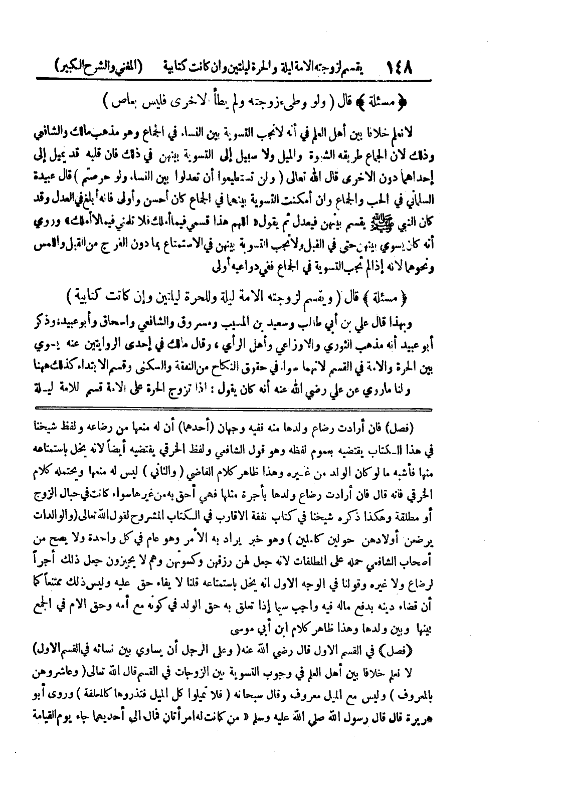 (فصل) فإن أرادت رضاع ولدها منه ففيه وجهان (أحدهما) أن له منعها من رضاعة ولفظ شيخنا في هذا الكتاب يقتضيه بعموم لفظه وهو قول الشافعي ولفظ الخرقي يقتضيه أيضاً لأنه يخل باستمتاعه منها فأشبه ما لو كان الولد من غيره وهذا ظاهر كلام القاضي (والثاني) ليس له منعها ويحتمله كلام الخرقي فإنه قال فإن أرادت رضاع ولدها بأجرة مثلها فهي أحق به من غيرها سواء كانت في حبال الزوج أو مطلقة وهكذا ذكره شيخنا في كتاب نفقة الأقارب في الكتاب المشروح لقول الله تعالى (والوالدات يرضعن أولادهن حولين كاملين) وهو خبر يراد به الأمر وهو عام في كل واحدة ولا يصح من أصحاب الشافعي حمله على المطلقات لأنه جعل لهن رزقهن وكسوتهن وهم لا يجيزون جعل ذلك أجراً لرضاع ولا غيره وقولنا فط الوجه الأول أنه يخل باستمتاعه قلنا لإيفاء حق عليه وليس ذلك ممتنعاً كما أن قضاء دينه بدفع ماله فيه واجب سيما إذا تعلق به حق الولد في كونه مع أمه وحق الأم في الجمع بينها وبين ولدها وهذا ظاهر كلام ابن أبي موسى * (فصل) * في القسم الأول قال رضي الله عنه (وعلى الرجل أن يساوي بين نسائه في القسم الأول) لا نعلم خلافاً بين أهل العلم في وجوب التسوية بين الزوجات في القسم قال الله تعالى (وعاشروهن بالمعروف) وليس مع الميل معروف وقال سبحانه (فلا تميلوا كل الميل فتذروها كالمعلقة) وروى أبو هريرة قال قال رسول الله صلى الله عليه وسلم " من كانت له امرأتان إلى أحديهما جاء يوم القيامة
