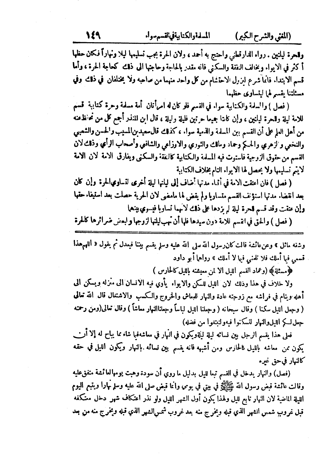 ولا خلاف في هذا وذلك لأن الليل لسكن والإيواء يأوي فيه الإنسان الى منزله ويسكن الى أهله وينام في فراشه مع زوجته عادة والنهار للمعاش والخروج والكسب والاشتغال قال الله تعالى (وجعل الليل سكنا) وقال سبحانه (وجعلنا الليل لباسا وجعلنا النهار معاشا) وقال تعالى (ومن رحمته جعل لكم الليل والنهار لتسكنوا فيه ولتبتغوا من فضله) فعلى هذا يقسم الرجل بين نسائه ليلة ليلة ويكون في النهار في معاشه فيما شاء مما يباح له إلا أن يكون ممن معاشه بالليل كالحارس ومن أشبه فإنه يقسم بين نسائه بالنهار ويكون الليل في حقه كالنهار في حق غيره (فصل) والنهار يدخل في القسم تبعا لليل بدليل ما روي أن سودة وهبت يومها لعائشة متفق عليه وقالت عائشة قبض رسول الله صلى الله عليه وسلم في بيتي في يومي وإنما قبض صلى الله عليه وسلم نهاراً ويتبع اليوم الليلة الماضية لأن النهار تابع لليل ولهذا يكون أول الشهر الليل ولو نذر اعتكاف شهر دخل معتكفه قبل غروب شمس الشهر الذي قبله ويخرج منه بعد غروب شمس الشهر الذي قبله ويخرج منه من بعد