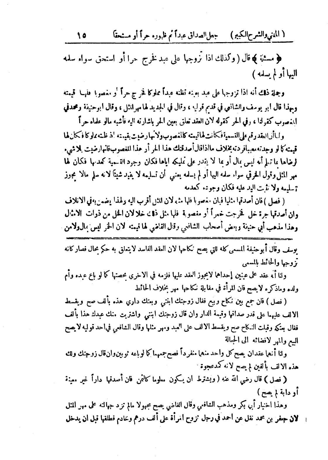 يوسف وقال أبو حنيفة المسمى كله للتي يصح نكاحها لأن العقد الفاسد لا يتعلق به حكم بحال فصار كأنه تزوجها والحائط بالمسمى ولنا أنه عقد على عينين إحداهما لا يجوز العقد عليها فلزمه في الاخرى بحصتها كما لو باع عبده وأم ولده وما ذكره لا يصح فإن المرأة في مقابلة نكاحها مهر بخلاف الحائط (فصل) فإن جمع بين نكاح وبيع فقال زوجتك ابنتي وبعتك داري هذه بألف صح ويقسط الألف عليهما على قدر صداقها وقيمة الدار وإن قال زوجتك ابنتي واشتريت منك عبدك هذا بألف فقال بعتكه وقبلت النكاح صح ويسقط الألف على العبد ومهر مثلها وقال الشافعي في أحد قوليه لا يصح البيع والمهر لإفضائه إلى الجعالة ولنا أنهما عقدان يصح كل واحد منهما منفرداً فصح جمعهما كما لو باعه ثوبين وإن قال زوجتك ولك هذه الألف بألفين لم يصح لأنه كمدعجوة * (فصل) * قال رضي الله عنه (ويشترط أن يكون معلوما كالثمن فإن أصدقها داراً غير معينة أو دابة لم يصح) وهذا اخنيار أبي بكر ومذهب الشافعي وقال القاضي يصح مجهولاً ما لم تزد جهالته على مهر المثل لأن جعفر بن محمد نقل عن أحمد في رجل تزوج امرأة على ألف درهم وخادم فطلقها قبل أن يدخل