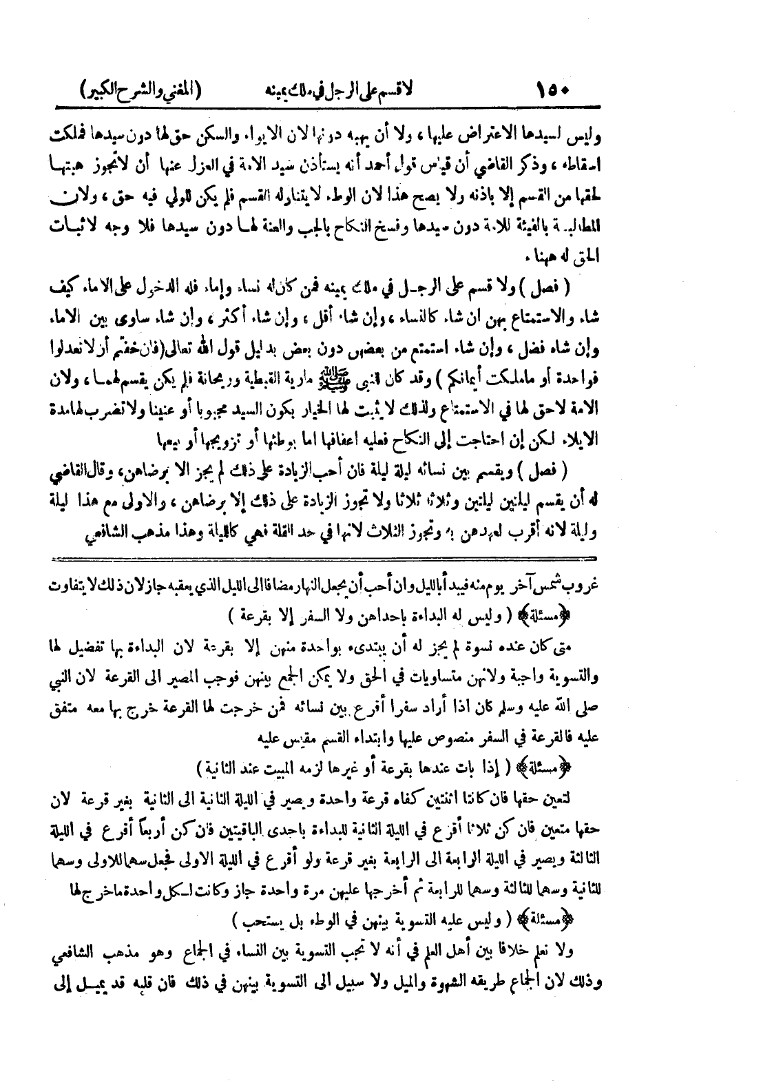 غروب شمس آخر يوم منه فيبدأ بالليل وإن أحب أن يجعل النهار مضافاً الى الليل الذي يعقبه جاز لأن ذلك لا يتفاوت * (مسألة) * (وليس له البداءة بإحداهن ولا السفر إلا بقرعة) متى كان عنده نسوة لم يجز له أن يبتدئ بواحدة منهن إلا بقرعة لأن البداءة بها تفضيل لها والتسوية واجبة ولأنهن متساويات في الحق ولا يمكن الجمع بينهن فوجب المصير إلى القرعة لأن النبي صلى الله عليه وسلم كان إذا أراد سفراً أفرع بين نسائه فمن خرجت لها القرعة خرج بها معه متفق عليه فالقرعه في السفر منصوص عليها وابتداء القسم مقيس عليه * (مسألة) * (إذا بات عندها بقرعة أو غيرها لزمه المبيت عند الثانية) لتعين حقها فإن كانتا اثنتين كفاه قرعة واحدة ويصير في الليلة الثانية الى الثانية بغير قرعة لأن حقها متعين فإن كن ثلاثاً أقرع في الليلة الثانية للبداءة باجدى الباقيتين فإن كن أربعاً أقرع في الليلة الثالثة ويصير في الليلة الى الرابعة بغير قرعة ولو أقرع في الليلة الاولى فجعل سهما للأولى وسهما