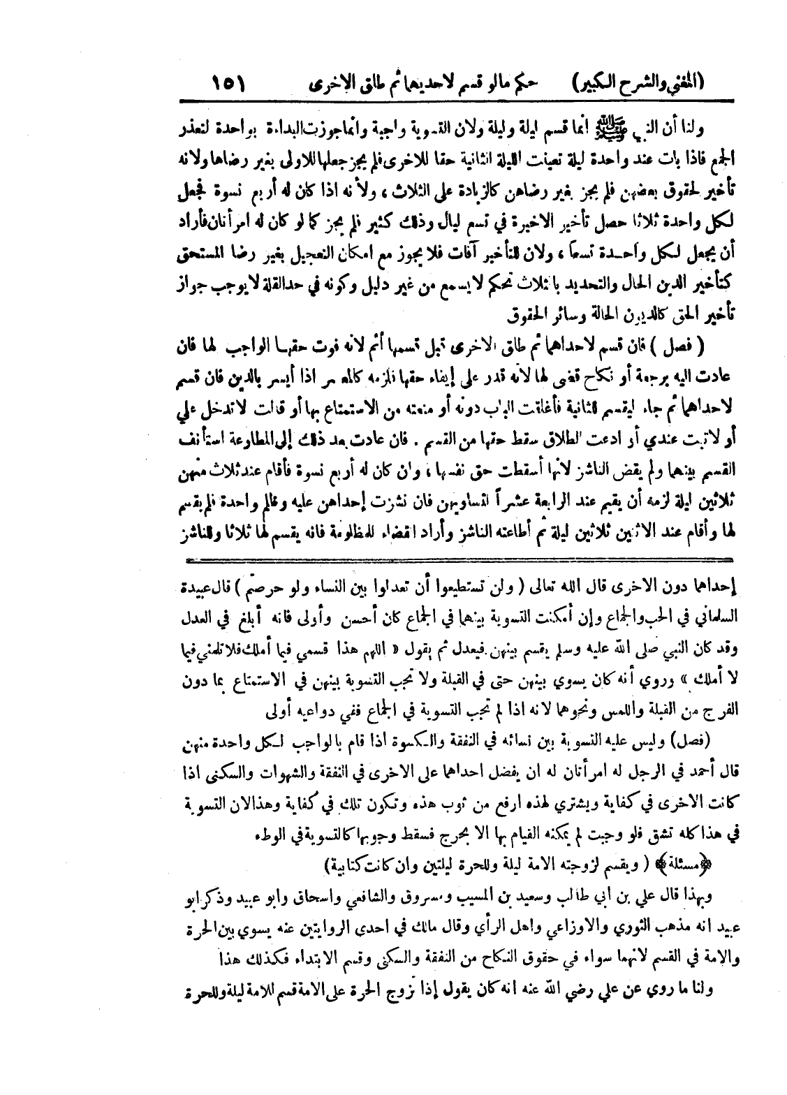 إحداهما دون الأخرى قال الله تعالى (ولن تستطيعوا أن تعدلوا بين النساء ولو حرصتم) قال عبيدة السلماني في الحب والجماع وإن أمكنت التسوية بينهما في الجماع كان أحسن وأولى فانه أبلغ في العدل وقد كان النبي صلى الله عليه وسلم يقسم بينهن فيعدل ثم يقول " اللهم هذا قسمي فيما أملك فلا تلمني فيما لا أملك " وروي أنه كان يسوي بينهن حتى في القبلة ولا تجب التسوية بينهن في الاستمتاع بما دون الفرج من القبلة واللمس ونحوهما لأنه إذا لم تجب التسوية في الجماع ففي دواعيه أولى (فصل) وليس عليه التسوية بين نسائه في النفقة والكسوة إذا قام بالواجب لكل واحدة منهن قال أحمد في الرجل له امرأتان له ان يفضل إحداهما على الأخرى في النفقة والشهوات والسكنى إذا كانت الاخرى في كفاية ويشتري لهذه أرفع من ثوب هذه وتكون تلك في كفاية وهذا لأن التسوية في هذا كله تشق فلو وجبت لم يمكنه القيام بها إلا بحرج فسقط وجوبها كالتسوية في الوطئ * (مسألة) * (ويقسم لزوجته الأمة ليلة وللحرة ليلتين وإن كانت كتابية) وبهذا قال علي بن أبي طالب وسعيد بن المسيب ومسروق والشافعي واسحاق وأبو عبيد وذكر أبو عبيد أنه مذهب الثوري والاوزاعي واهل الرأي وقال مالك في إحدى الروايتين عنه يسوي بين الحرة والأمة في القسم لأنهما سواء في حقوق النكاح من النفقة والسكنى وقسم الابتداء فكذلك هذا ولنا ما روى عن علي رضي الله عنه أنه كان يقول إذا تزوج الحرة على الأمة قسم للأمة ليلة وللحرة
