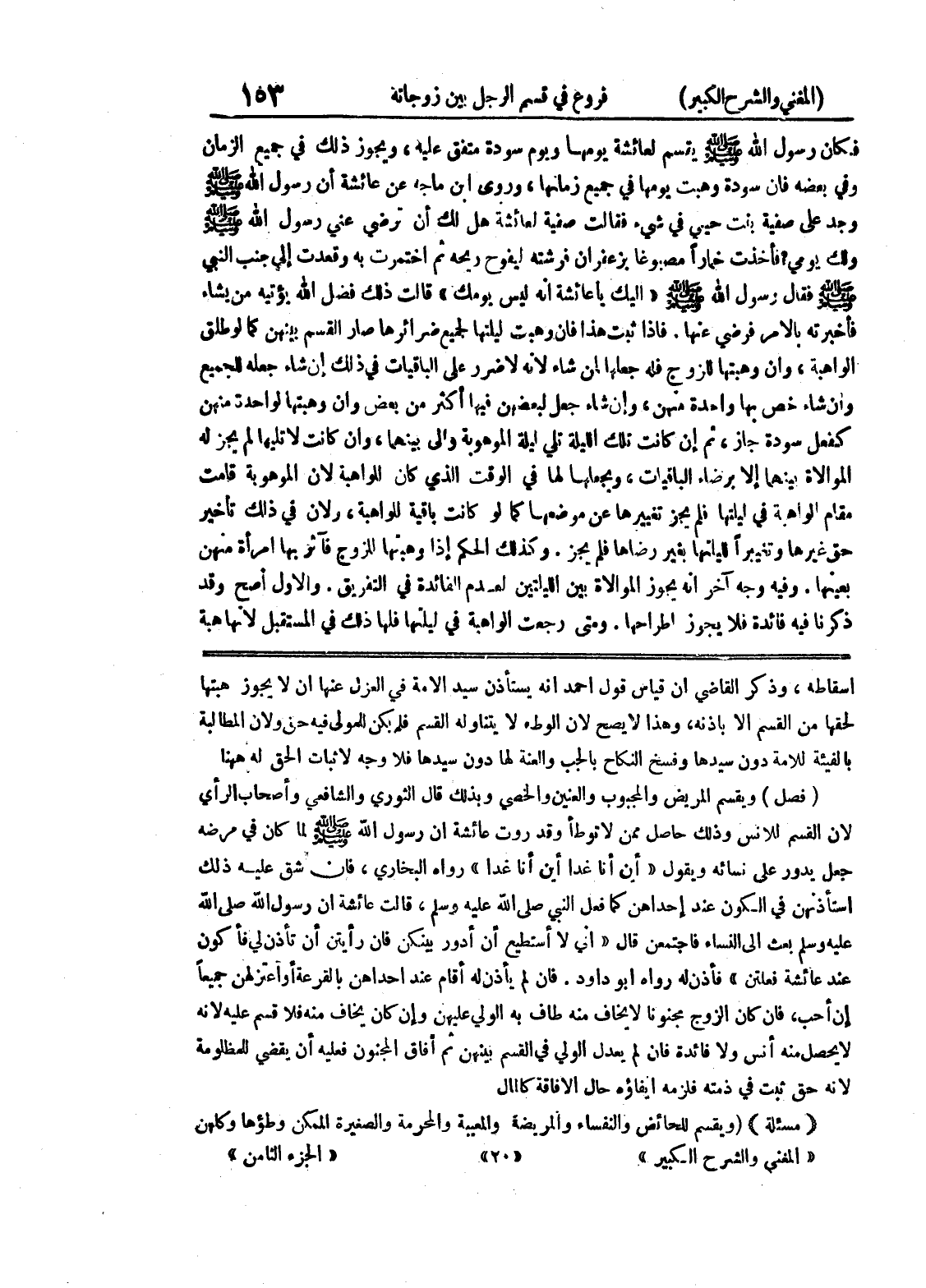 اسقاطه، وذكر القاضي أن قياس قول أحمد أنه يستأذن سيد الأمة في العزل عنها أن لا يجوز هبتها لحقها من القسم إلا باذنه، وهذا لا يصح لأن الوطئ لا يتناوله القسم فلم يكن للمولى فيه حق ولأن المطالبة بالفيئة للأمة دون سيدها وفسخ النكاح بالجب والعنة لها دون سيدها فلا وجه لإثبات الحق له ههنا (فصل) ويقسم المريض والمجبوب والعنين والخصي وبذلك قال الثوري والشافعي وأصحاب الرأي لأن القسم للأنس وذلك حاصل ممن لا توطأ وقد روت عائشة أن رسول الله صلى الله عليه وسلم لما كان في مرضه جعل يدور على نسائه ويقول " أين أنا غداً أين أنا غداً " رواه البخاري، فإن شق عليه ذلك استأذنهن في الكون عند إحداهن كما فعل النبي صلى الله عليه وسلم، قالت عائشة أن رسول الله صلى الله عليه وسلم بعث إلى النساء فاجتمعن قال " إني لا أستطيع أن أدور بينكن فإن رأيتن أن تأذن لي فأكون عند عائشة فعلتن " فأذن له رواه أبو داود.