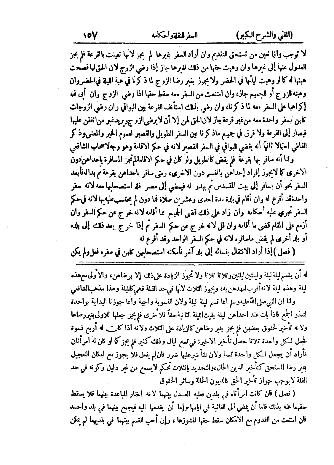 له أن يقسم ليلة ليلة وليلتين ليلتين وثلاثا ثلاثا ولا تجوز الزيادة على ذلك إلا برضاهن، والأولى مع هذه ليلة وهذه ليلة لأنه أقرب لعهدهن به، ويجوز الثلاث لأنها في حد القلة فهي كالليلة وهذا مذهب الشافعي ولنا أن النبي صلى الله عليه وسلم إنما قسم ليلة ليلة ولأن التسوية واجبة وإنما جوزنا البداية بواحدة لتعذر الجمع فإذا بات عند إحداهن ليلة بقيت الليلة الثانية حقاً للأخرى فلم يجز جعلها للأولى بغير رضاها ولانه تأخير لحقوق بعضهن فلم يجز بغير رضاهن كالزيادة على الثلاث ولأنه إذا كان له أربع نسوة فجعل لكل واحدة ثلاثا حصل تأخير الأخيرة في تسع ليال وذلك كثير فلم يجز كما لو كان له امرأتان فأراد أن يجعل لكل واحدة تسعا ولأن للتأخير عليها ضرر فان لم يفعل فلا يجوز مع إمكان التعجيل بغير رضا المستحق كتأخير الدين الحال، والتحديد بالثلاث تحكم لا يسمع من غير دليل وكونه في حد القلة لا يوجب جواز تأخير الحق كالديون الحالة وسائر الحقوق (فصل) فإن كانت امرأتاه في بلدين فعليه العدل بينهما لأنه اختار المباعدة بينهما فلا يسقط حقهما عنه بذلك فإما أن يمضي الى الغائبة في أيامها وإما أن يقدمها إليه فيجمع بينهما في بلد واحد فإن امتنعت من القدوم مع الامكان سقط حقها لنشوزها، وإن أحب القسم بينهما في بلديهما لم يمكن