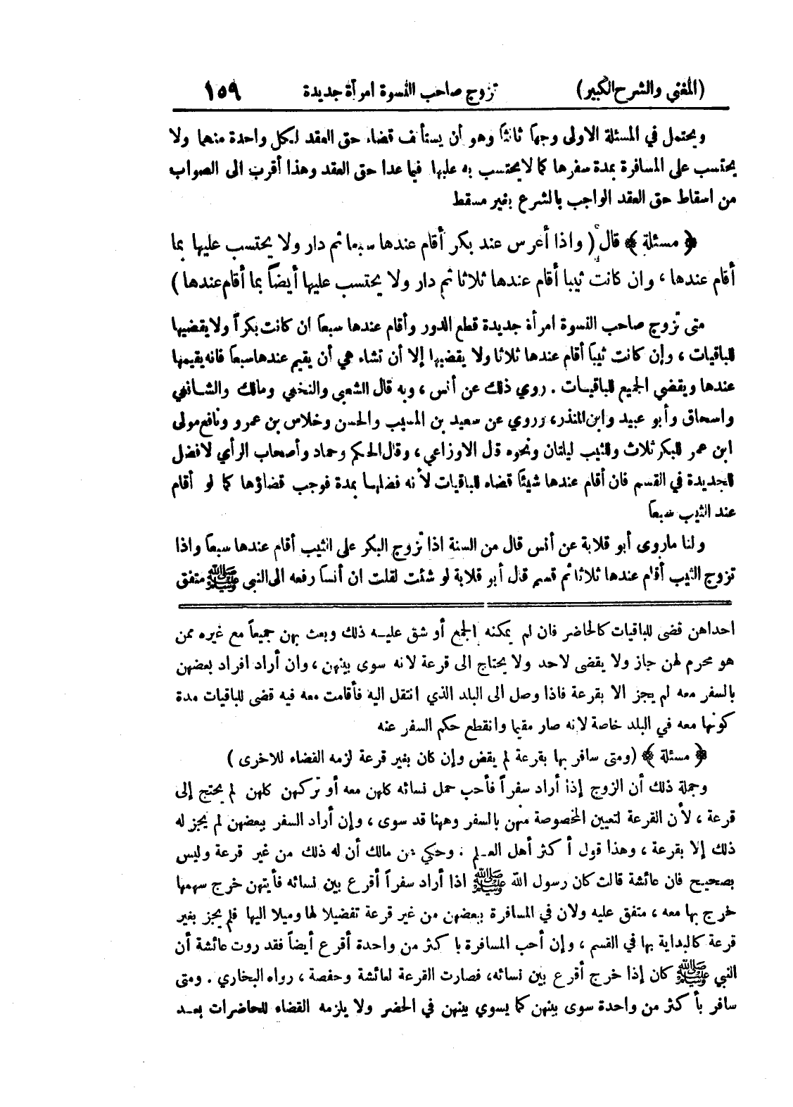 إحداهن قضى للباقيات كالحاضر فان لم يمكنه الجمع أو شق عليه ذلك وبعث بهن جميعاً مع غيره ممن هو محرم لهن جاز ولا يقضي لأحد ولا يحتاج إلى قرعة لأنه سوى بينهن، وإن أراد افراد بعضهن بالسفر معه لم يجز إلا بقرعة فإذا وصل إلى البلد الذي انتقل إليه فأقامت معه فيه قضي للباقيات مدة كونها معه في البلد خاصة لأنه صار مقيماً وانقطع حكم السفر عنه * (مسألة) * (ومتى سافر بها بقرعة لم يقض وإن كان بغير قرعة لزمه القضاء للأخرى) وجملة ذلك أن الزوج إذا أراد سفراً فأحب حمل نسائه كلهن معه أو تركهن كلهن لم يحتج إلى قرعة، لأن القرعة لتعيين المخصوصة منهن بالسفر وههنا قد سوى، وإن أراد السفر ببعضهن لم يجز له ذلك إلا بقرعة، وهذا قول أكثر أهل العلم.