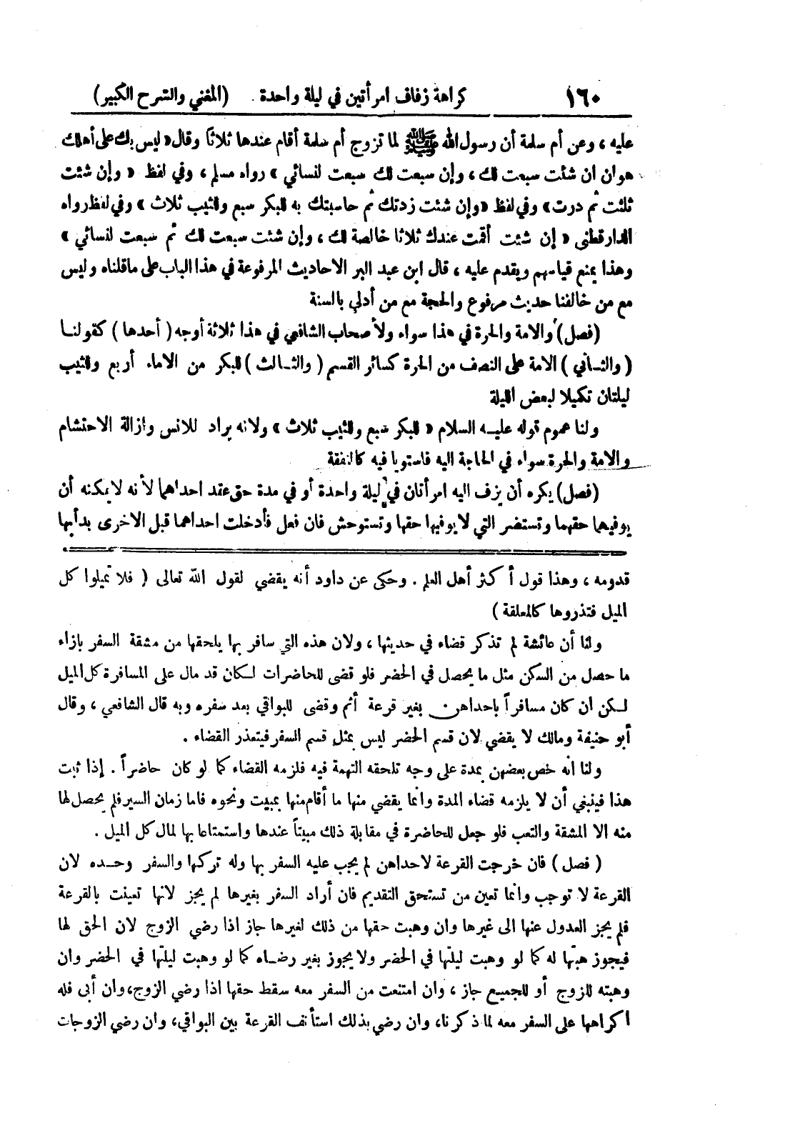 وحكي عن داود أنه يقضي لقول الله تعالى (فلا تميلوا كل الميل فتذروها كالمعلقة) ولنا أن عائشة لم تذكر قضاء في حديثها، ولأن هذه التي سافر بها يلحقها من مشقة السفر بإزاء ما حصل من السكن مثل ما يحصل في الحضر فلو قضى للحاضرات لكان قد مال على المسافرة كل الميل لكن إن كان مسافراً بإحداهن بغير قرعة أثم وقضى للبواقي بعد سفره وبه قال الشافعي، وقال أبو حنيفة ومالك لا يقضي لأن قسم الحضر ليس بمثل قسم السفر فيتعذر القضاء.