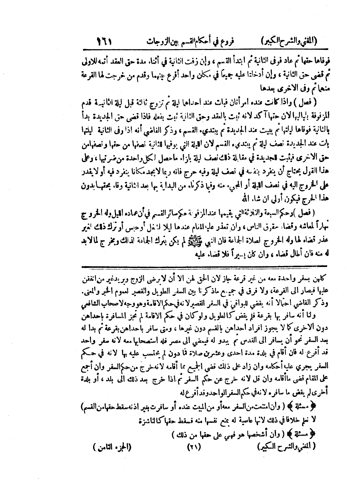 دون الأخرى كما لا يحوز إفراد إحداهن بالقسم دون غيرها، ومتى سافر بإحداهن بقرعة ثم بدا له بعد السفر نحو أن يسافر الى القدس ثم يبدو له فيمضي الى مصر فله استصحابها معه لأنه سفر واحد قد أقرع له فإن أقام في بلدة مدة احدى وعشرين صلاة فما دون لم يحتسب عليه بما لأنه في حكم السفر يجري عليه أحكامه وإن زاد على ذلك قضى الجميع مما أقامه لأنه خرج من حكم السفر وإن أجمع على المقام قضى ما أقامه وإن قل لأنه خرج عن حكم السفر ثم إذا خرج بعد ذلك إلى بلد، أو بلدة أخرى لم يقض ما سافره لأنه في حكم السفر الواحد وقر أقرع له * (مسألة) * (وإن امتنعت من السفر معه أو من المبيت عنده أو سافرت بغير اذنه سقط حقها من القسم) لا نعلم خلافاً في ذلك لأنها عاصية له بمنع نفسها منه فسقط حقها كالناشزة * (مسألة) * (وإن أشخصها هو فهي على حقها من ذلك)