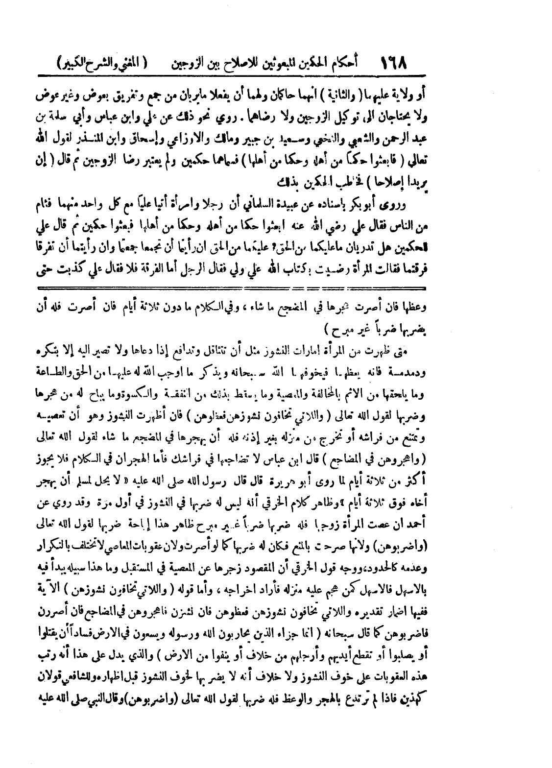 (واضربوهن) ولأنها صرحت بالمنع فكان له ضربها كما لو أصرت ولأن عقوبات المعاصي لا تختلف بالتكرار وعدمه كالحدود، ووجه قول الخرقي أن المقصود زجرها عن المعصية في المستقبل وما هذا سبيله يبدأ فيه بالأسهل فالأسهل كمن هجم عليه منزله فأراد إخراجه، وأما قوله (واللاتي تخافون نشوزهن) الآية ففيها اضمار تقديره واللاتي تخافون نشوزهن فعظوهن فإن نشزن فاهجروهن في المضاجع فإن اصررن فاضربوهن كما قال سبحانه (إنما جزاء الذين يحاربون الله ورسوله ويسعون في الأرض فسادا أن يقتلوا أو يصلبوا أو تقطع أيديهم وأرجلهم من خلاف أو ينفوا من الأرض) والذي يدل على هذا أنه رتب هذه العقوبات على خوف النشوز ولا خلاف أنه لا يضر بها لخوف النشوز قبل اظهاره وللشافعي قولان كهذين فإذا لم ترتدع بالهجر والوعظ فله ضربها لقول الله تعالى (واضربوهن) وقال النبي صلى الله عليه