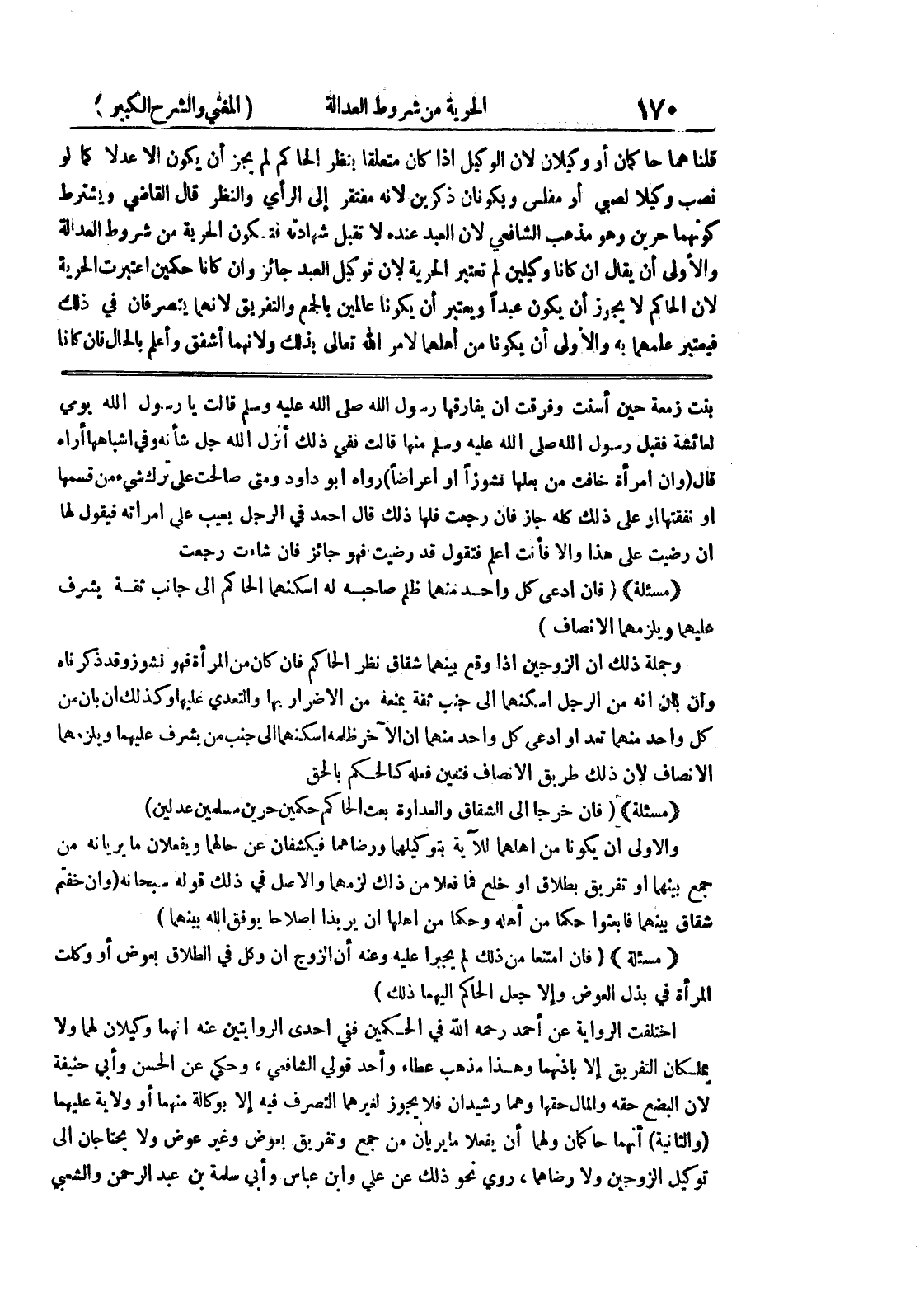 جمع بينهما أو تفريق بطلاق أو خلع فما فعلا من ذلك لزمهما والأصل في ذلك قوله سبحانه (وإن خفتم شقاق بينهما فابعثوا حكما من أهله وحكما من أهلها إن يريدا إصلاحا يوفق الله بينهما) * (مسألة) * (فإن امتنعا من ذلك لم يجبرا عليه وعنه إن الزوج إن وكل في الطلاق بعوض أو وكلت المرأة في بذل العوض وإلا جعل الحاكم إليهما ذلك) اختلفت الرواية عن أحمد رحمه الله في الحكمين ففي إحدى الروايتين عنه أنهما وكيلان لهما ولا يملكان التفريق إلا باذنهما وهذا مذهب عطاء وأحد قولي الشافعي، وحكي عن الحسن وأبي حنيفة لأن البضع حقه والمال حقها وهما رشيدان فلا يجوز لغيرهما التصرف فيه إلا بوكالة منهما أو ولاية عليهما (والثانية) أنهما حاكمان ولهما أن يفعلا ما يريان من جمع وتفريق بعوض وغير عوض ولا يحتاجان إلى توكيل الزوجين ولا رضاهما، روي نحو ذلك عن علي وابن عباس وأبي سلمة بن عبد الرحمن والشعبي