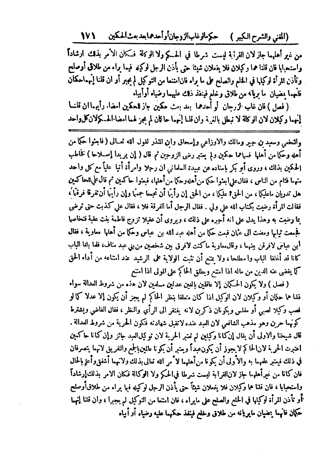 فقال الرجل أما الفرقة فلا، فقال علي كذبت حتى ترضى بما رضيت به وهذا يدل على أنه أجبره على ذلك، ويروى أن عقيلاً تزوج فاطمة بنت عقبة فتخاصما فجمعت ثيابها ومضت إلى عثمان فبعث حكماً من أهله عبد الله بن عباس وحكماً من أهلها معاوية، فقال ابن عباس لأفرقن بينهما، وقال معاوية ما كنت لافرق بين شخصين من بني عبد مناف، فلما بلغا الباب كانا قد أغلقا الباب واصطلحا، ولا يمتنع أن تثبت الولاية على الرشيد عند امتناعه من أداء الحق كما يقضى عنه الدين من ماله إذا امتنع ويطلق الحاكم على المولى إذا امتنع (فصل) ولا يكون الحكمان إلا عاقلين بالغين عدلين مسلمين لأن هذه من شروط العدالة سواء