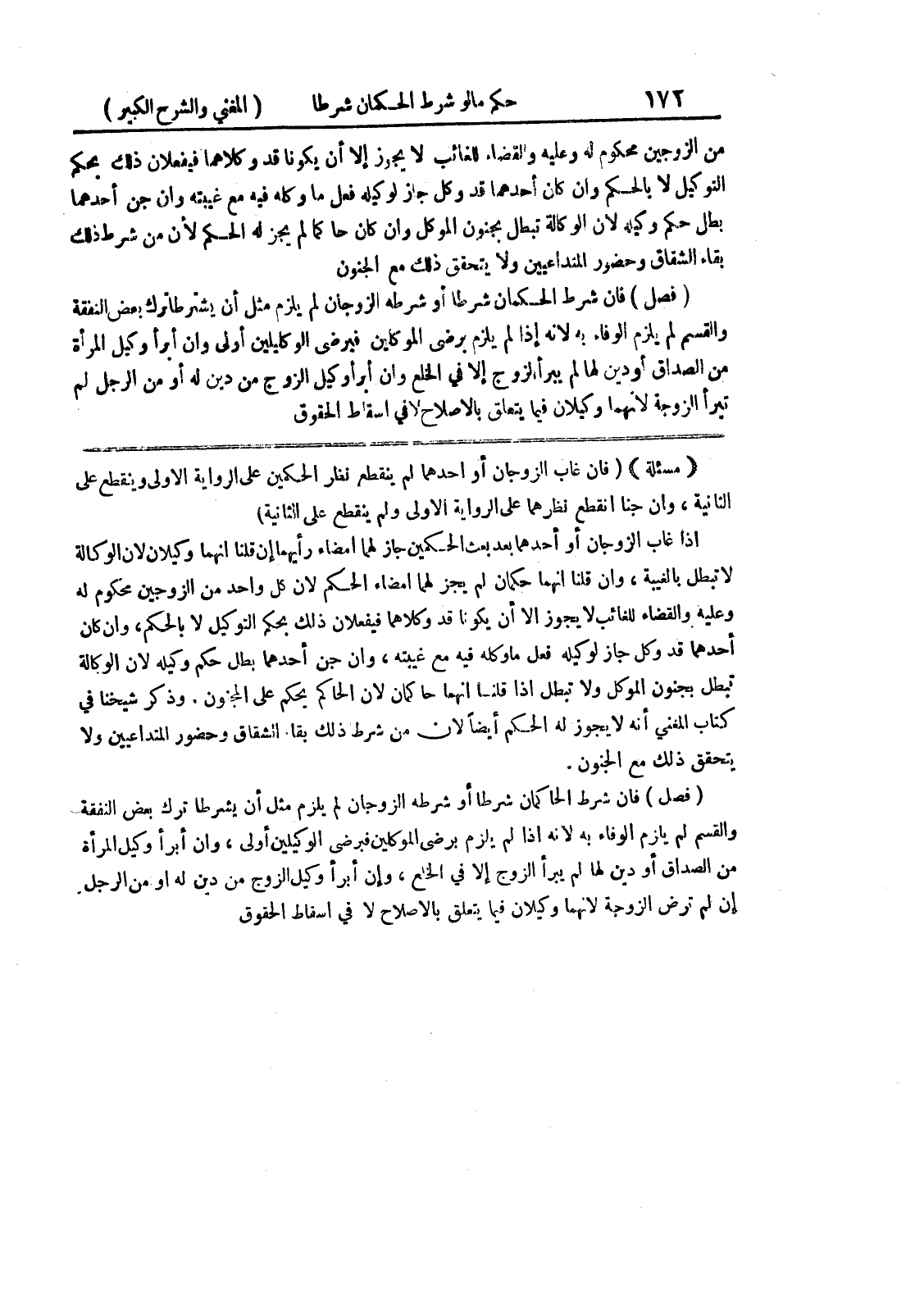(فصل) فإن شرط الحاكمان شرطاً أو شرطه الزوجان لم يلزم مثل أن يشرطا ترك بعض النفقة والقسم لم يلزم الوفاء به لأنه إذا لم يلزم برضى الموكلين فبرضى الوكيلين أولى، وإن أبرأ وكيل المرأة