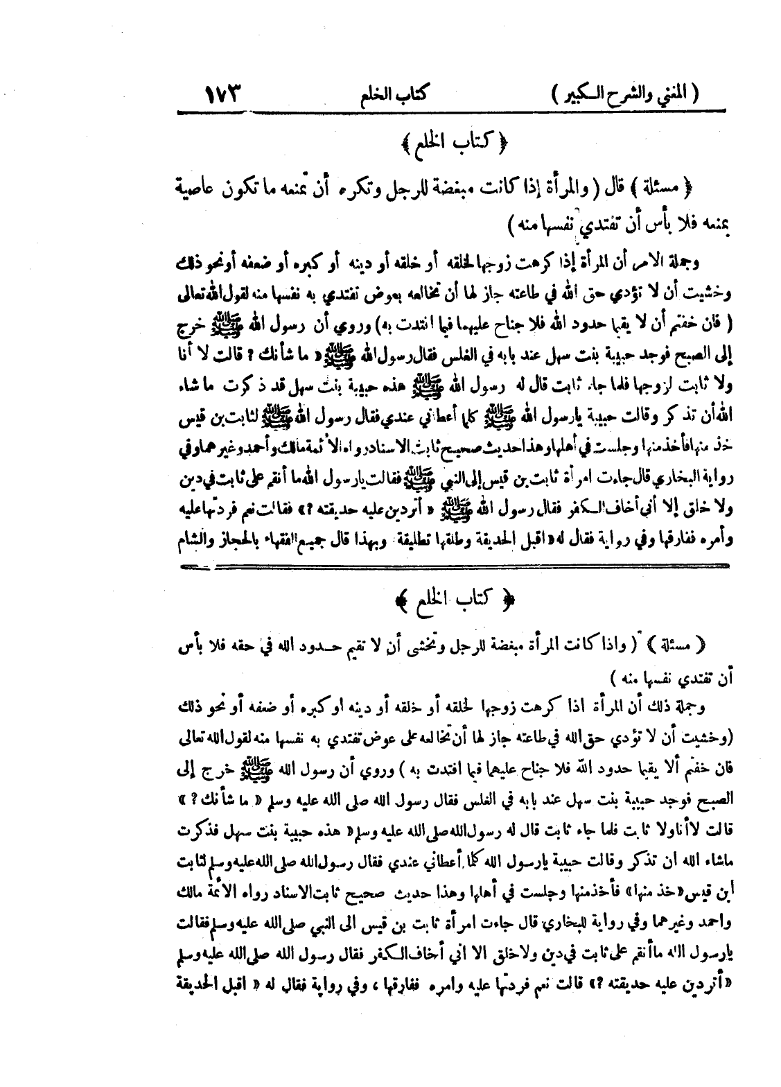 * (كتاب الخلع) * * (مسألة) * (وإذا كانت المرأة مبغضة للرجل وتخشى أن لا تقيم حدود الله في حقه فلا بأس أن تفتدي نفسها منه) وجملة ذلك أن المرأة إذا كرهت زوجها لخلقه أو خلقه أو دينه أو كبره أو ضعفه أو نحو ذلك (وخشيت أن لا تؤدي حق الله في طاعته جاز لها أن تخالعه على عوض تفتدي به نفسها منه لقول الله تعالى فان خفتم الا يقيما حدود الله فلا جناح عليهما فيما افتدت به) وروي أن رسول الله صلى الله عليه وسلم خرج إلى الصبح فوجد حبيبة بنت سهل عند بابه في الغلس فقال رسول الله صلى الله عليه وسلم " ما شأنك؟ " قالت لا أنا ولا ثابت فلما جاء ثابت قال له رسول الله صلى الله عليه وسلم " هذه حبيبة بنت سهل فذكرت ما شاء الله أن تذكر وقالت حبيبة يا رسول الله كلما أعطاني عندي فقال رسول الله صلى الله عليه وسلم لثابت ابن قيس " خذ منها " فأخذ منها وجلست في أهلها وهذا حديث صحيح ثابت الإسناد رواه الأئمة مالك واحمد وغيرهما وفي رواية للبخاري قال جاءت امرأة ثابت بن قيس إلى النبي صلى الله عليه وسلم فقالت يا رسول الله ما أنقم على ثابت في دين ولا خلق إلا أني أخاف الكفر فقال رسول الله صلى الله عليه وسلم " أتردين عليه حديقته؟ " قالت نعم فردتها عليه وأمره ففارقها، وفي رواية فقال له " اقبل الحديقة