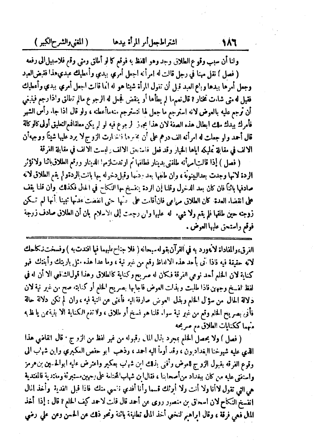 (فصل) ولا يحصل الخلع بمجرد بذل المال وقبوله من غير لفظ من الزوج قال القاضي هذا الذي عليه شيوخنا البغداديون، وقد أومأ إليه أحمد، وذهب أبو حفص العكبري وابن شهاب الى وقوع الفرقة بقبول الزوج للعوض وأفنى بذلك ابن شهاب بعكبر واعترض عليه أبو الحسين بن هرمز واستفتى عليه من كان ببغداد من أصحابنا، فقال ابن شهاب المختلعة على وجهين مستبرئة ومفتدية فالمفتدية هي التي تقول لا أنا ولا أنت ولا أبرئك قسماً وأنا أفدي نفسي منك فإذا قبل الفدية وأخذ المال انفسخ النكاح لأن إسحاق بن منصور روي عن أحمد قال قلت لأحمد كيف الخلع؟ قال: إذا أخذ المال فهي فرقة، وقال إبراهيم النخعي أخذ المال تطليقة بائنة ونحو ذلك عن الحسن وعن علي رضي