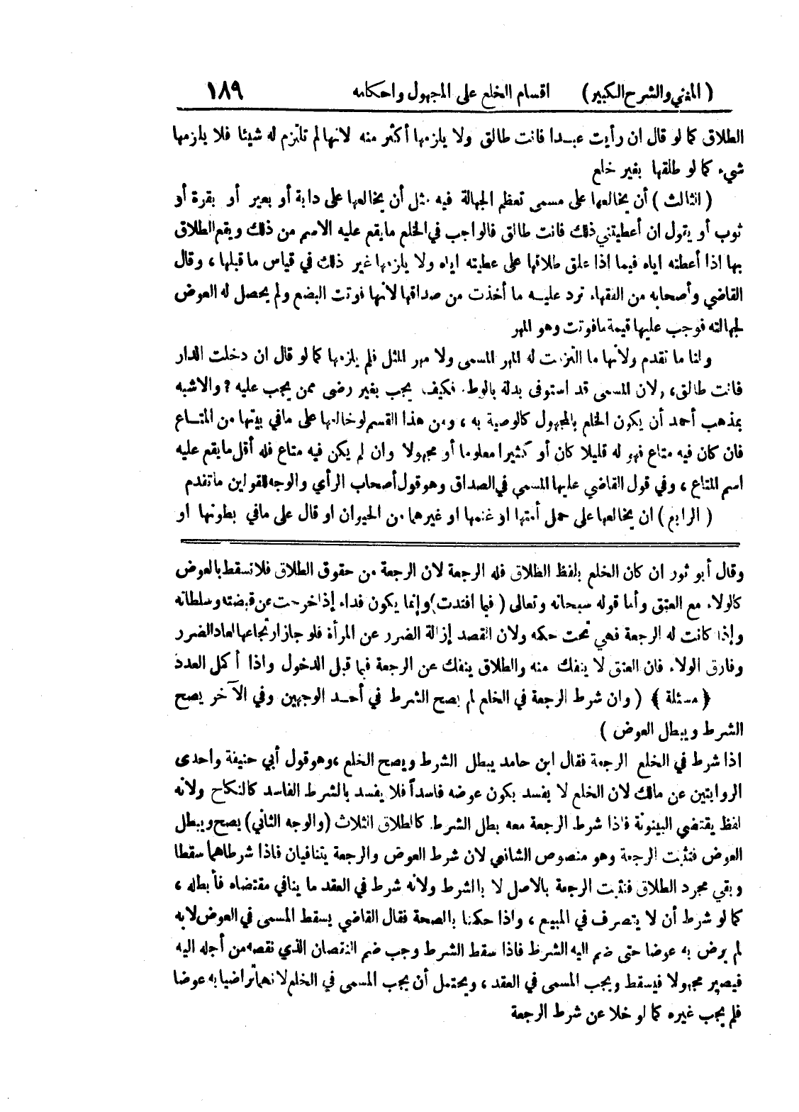 إذا شرط في الخلع الرجعة فقال ابن حامد يبطل الشرط ويصح الخلع، وهو قول أبي حنيفة وإحدى الروايتين عن مالك لأن الخلع لا يفسد بكون عوضه فاسداً فلا يفسد بالشرط الفاسد كالنكاح ولأنه لفظ يقتضي البينونة فإذا شرط الرجعة معه بطل الشرط كالطلاق الثلاث (والوجه الثاني) يصح ويبطل العوض فتثبت الرجعة وهو منصوص الشافعي لأن شرط العوض والرجعة يتنافيان فإذا شرطاهما سقطا وبقي مجرد الطلاق فتثبت الرجعة بالأصل لا بالشرط ولأنه شرط في العقد ما ينافي مقتضاه فأبطله، كما لو شرط أن لا يتصرف في المبيع، وإذا حكمنا بالصحة فقال القاضي يسقط المسمى في العوض لا به لم يرض به عوضاً حتى ضم إليه الشرط فإذا سقط الشرط وجب ضم النقصان الذي نقصه من أجله إليه فيصير مجهولاً فيسقط ويجب المسمى في العقد، ويحتمل أن يجب المسمى في الخلع لأنهما تراضيا به عوضاً فلم يجب غيره كما لو خلا عن شرط الرجعة