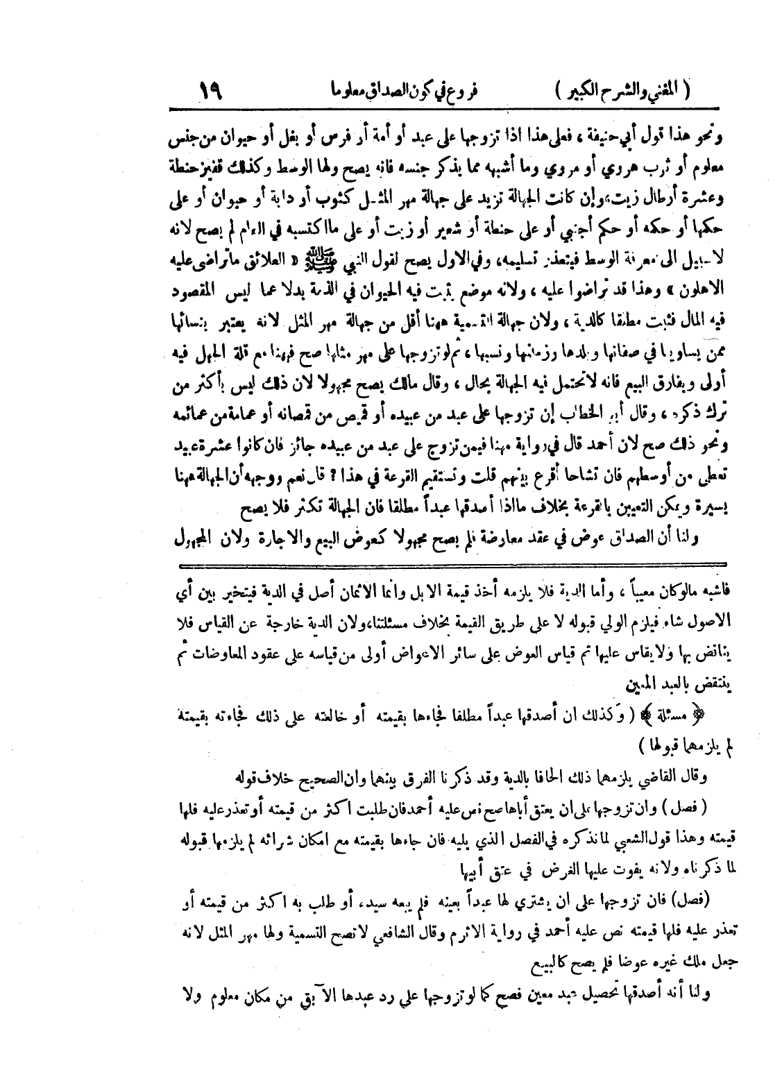 فأشبه ما لو كان معيباً، وأما الدية فلا يلزمه أخذ قيمة الابل وإنما الأثمان أصل في الدية فيتخير بين أي الأصول شاء فيلزم الولي قبوله لا على طريق القيمة بخلاف مسئلتنا، ولأن الدية خارجة عن القياس فلا يناقض بها ولا يقاس عليها ثم قياس العوض على سائر الأعواض أولى من قياسه على عقود المعاوضات ثم ينتقض بالعبد المعين * (مسألة) * (وكذلك إن أصدقها عبداً مطلقاً فجاءها بقيمته أو خالعته على ذلك فجاءته بقيمته لم يلزمهما قبولها) وقال القاضي يلزمهما ذلك الحاقا بالدية وقد ذكرنا الفرق بينهما وإن الصحيح خلاف قوله