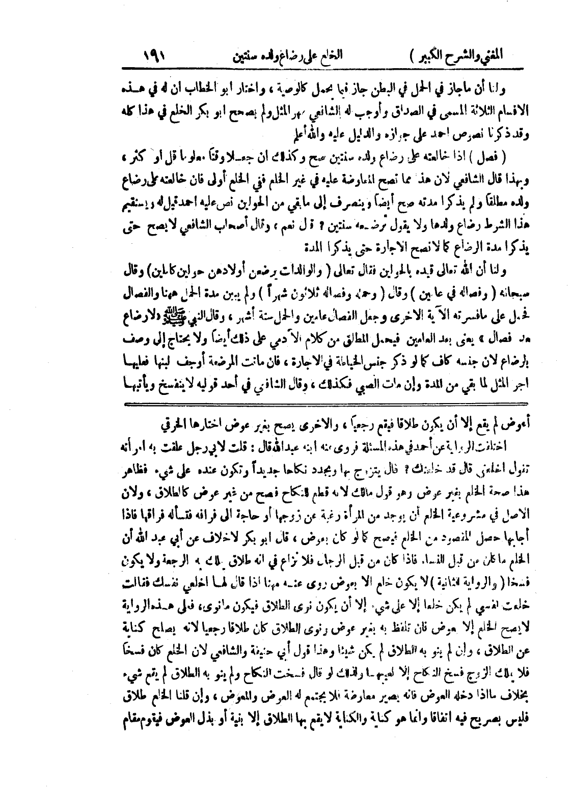 أعوض لم يقع إلا أن يكون طلاقاً فيقع رجعياً، والأخرى يصح بغير عوض اختارها الخرقي اختلفت الرواية عن احمد في هذه المسألة فروى عنه ابنه عبد الله قال: قلت لأبي رجل علقت به امرأته تقول اخلعني قال قد خلعتك؟ قال يتزوج بها ويجدد نكاحاً جديداً وتكون عنده على شئ فظاهر هذا صحة الخلع بغير عوض وهو قول مالك لانه قطع للنكاح فصح من غير عوض كالطلاق، ولأن الأصل في مشروعية الخلع أن يوجد من المرأة رغبة عن زوجها أو حاجة الى فراقه فتسأله فراقها فإذا أجابها حصل المقصود من الخلع فيصح كما لو كان بعوض، قال أبو بكر لا خلاف عن أبي عبد الله أن الخلع ما كان من قبل النساء فإذا كان من قبل الرجال فلا نزاع في أنه طلاق يملك به الرجعة ولا يكون فسخاً (والرواية الثانية) لا يكون خلع إلا بعوض روى عنه مهنا إذا قال لها اخلعي نفسك فقالت خلعت نفسي لم يكن خلعا إلا على شئ إلا أن يكون نوى الطلاق فيكون ما نوى، فعلى هذه الرواية لا يصح الخلع إلا بعوض فإن تلفظ به بغير عوض ونوى الطلاق كان طلاقاً رجعياً لأنه يصلح كناية عن الطلاق، وإن لم ينو به الطلاق لم يكن شيئاً وهذا قول أبي حنيفة والشافعي لأن الخلع كان فسخاً فلا يملك الزوج فسخ النكاح إلا لعيبها ولذلك لو قال فسخت النكاح ولم ينو به الطلاق لم يقع شئ بخلاف ما إذا دخله العوض فإنه يصير معاوضة فلا يجتمع له العوض والمعوض، وإن قلنا الخلع طلاق فليس بصريح فيه اتفاقاً وإنما هو كناية والكناية لا يقع بها الطلاق إلا بنية أو بذل العوض فيقوم مقام