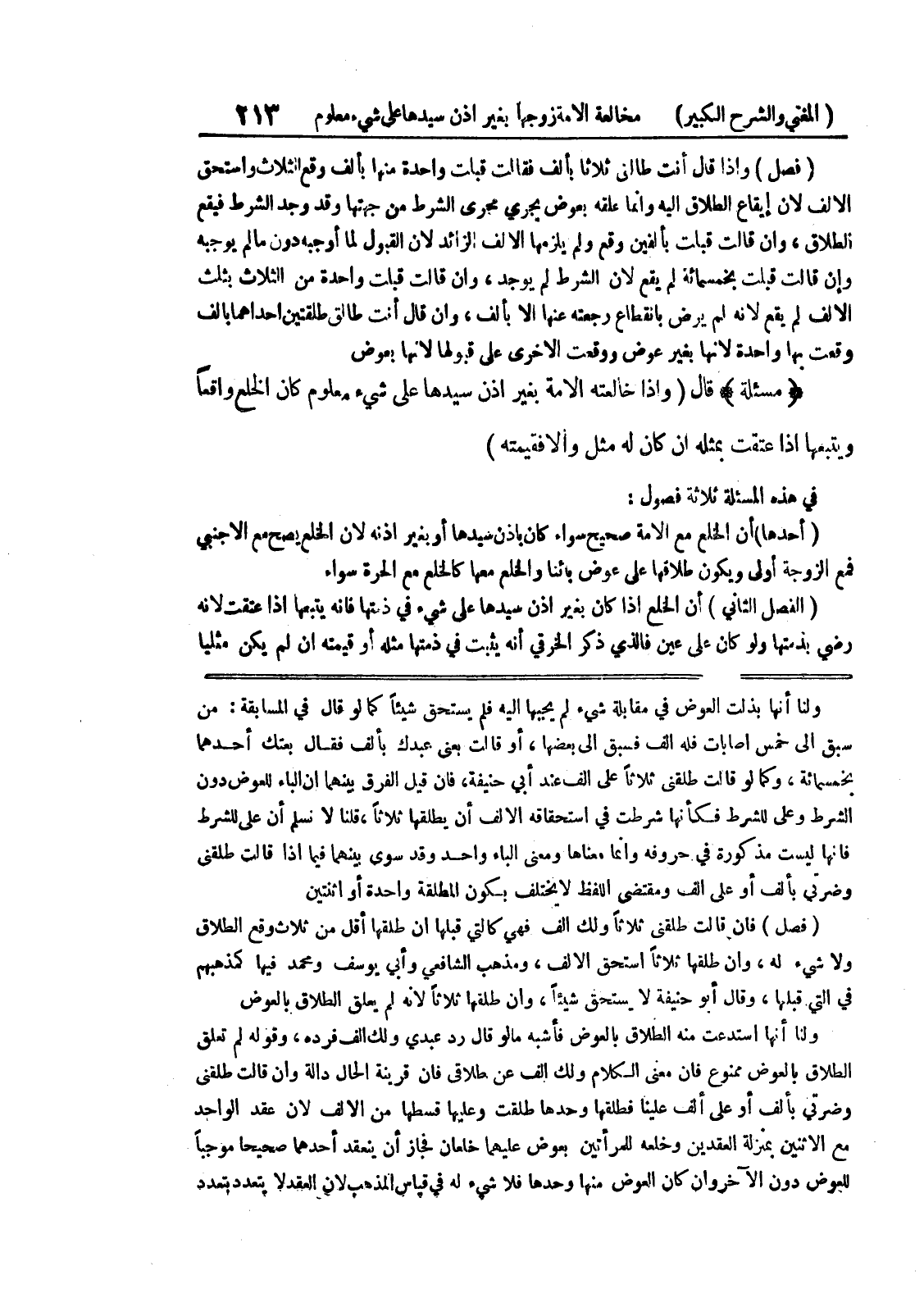 الشرط وعلى للشرط فكأنها شرطت في استحقاقه الألف أن يطلقها ثلاثاً، قلنا لا نسلم أن على للشرط فإنها ليست مذكورة في حروفه وإنما معناها ومعنى الباء واحد وقد سوى بينهما فيما إذا قالت طلقني وضرتي بألف أو على ألف ومقتضى اللفظ لا يختلف بكون المطلقة واحدة أو اثنتين (فصل) فإن قالت طلقني ثلاثاً ولك ألف فهي كالتي قبلها إن طلقها أقل من ثلاث وقع الطلاق ولا شئ له، وإن طلقها ثلاثا استحق الألف، ومذهب الشافعي وأبي يوسف ومحمد فيها كمذهبهم في التي قبلها، وقال أبو حنيفة لا يستحق شيئاً، وإن طلقها ثلاثاً لأنه لم يعلق الطلاق بالعوض ولنا أنها استدعت منه الطلاق بالعوض فأشبه ما لو قال رد عبدي ولك ألف فرده، وقوله لم تعلق الطلاق بالعوض ممنوع فإن معنى الكلام ولك ألف عن طلاقي فإن قرينة الحال دالة وإن قالت طلقني وضرتي بألف أو على ألف علينا فطلقها وحدها طلقت وعليها قسطها من الألف لأن عقد الواحد مع الاثنين بمنزلة العقدين وخلعه للمرأتين بعوض عليهما خلعان فجاز أن ينعقد أحدهما صحيحاً موجباً للعوض دون الآخر وإن كان العوض منها وحدها فلا شئ له في قياس المذهب لأن العقد لا يتعدد بتعدد