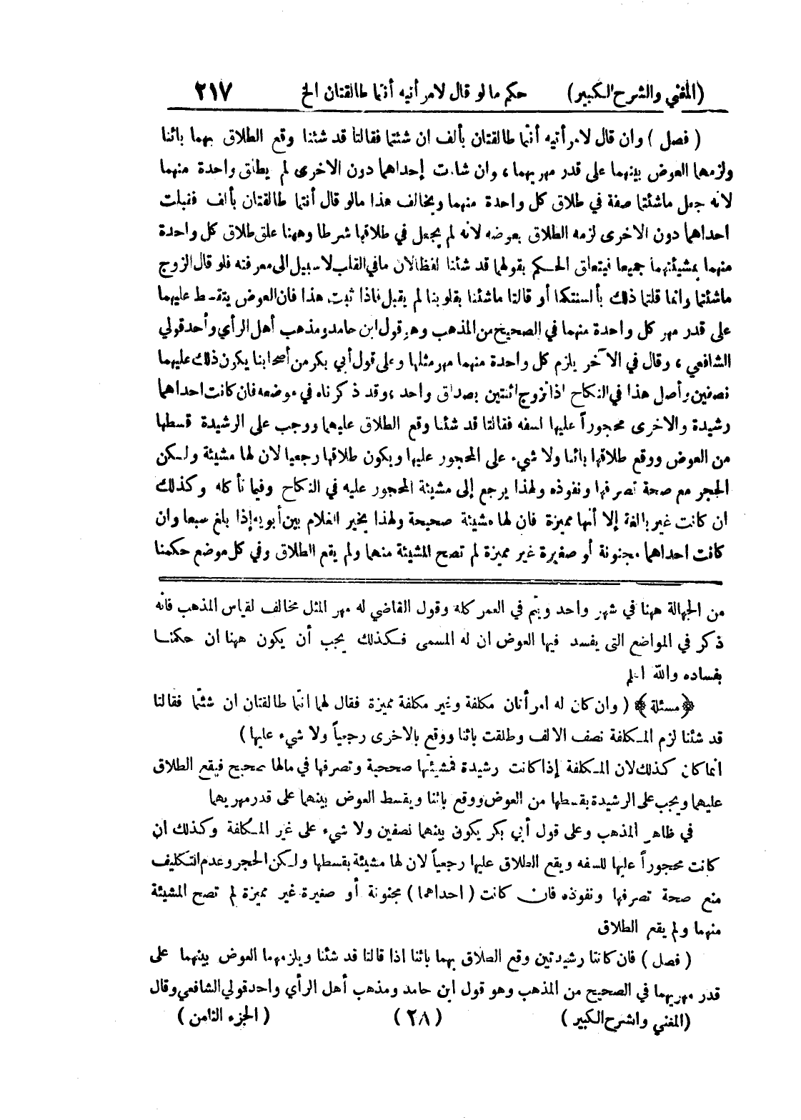 منهما ولم يقع الطلاق (فصل) فإن كانتا رشيدتين وقع الطلاق بهما بائناً إذا قالتا قد شئنا ويلزمهما العوض بينهما على قدر مهريهما في الصحيح من المذهب وهو قول ابن حامد ومذهب أهل الرأي وأحد قولي الشافعي وقال