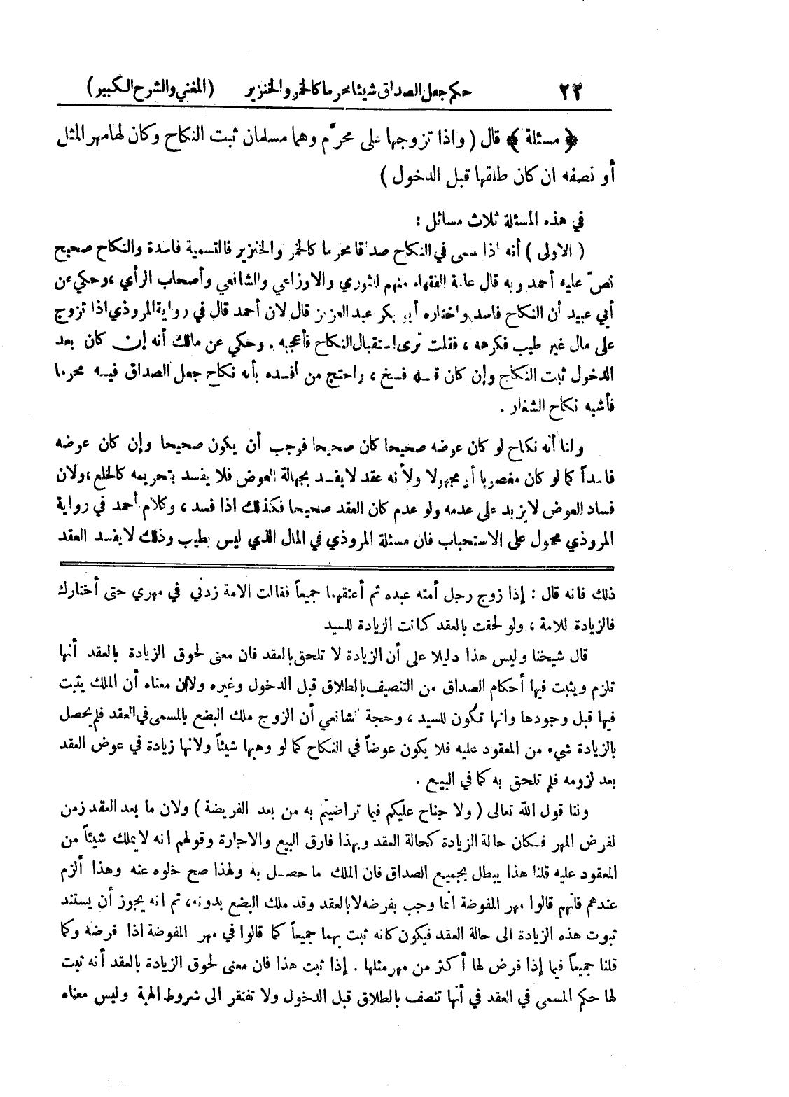 ذلك فإنه قال: إذا زوج رجل أمته عبده ثم أعتقهما جميعا فقال الأمة زدني في مهري حتى أختارك فالزيادة للامة، ولو لحقت بالعقد كانت الزيادة للسيد قال شيخنا وليس هذا دليلاً على أن الزيادة لا تلحق بالعقد فإن معنى لحوق الزيادة بالعقد أنها تلزم ويثبت فيها أحكام الصداق من التنصيف بالطلاق قبل الدخول وغيره ولان معناه أن الملك يثبت فيها قبل وجودها وأنها تكون للسيد، وحجة الشافعي أن الزوج ملك البضع بالمسمى في العقد فلم يحصل بالزيادة شئ من المعقود عليه فلا يكون عوضاً في النكاح كما لو وهبها شيئاً ولأنها زيادة في عوض العقد بعد لزومه فلم تلحق به كما في البيع.