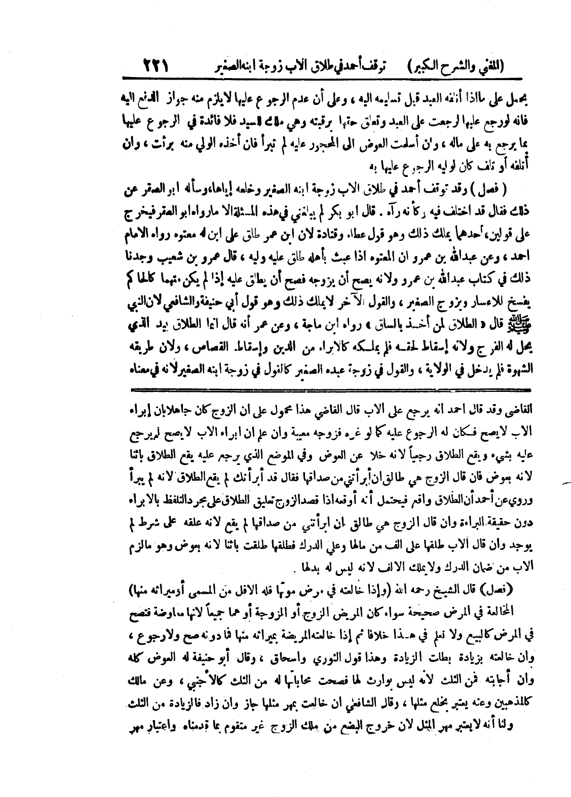 القاضي وقد قال أحمد أنه يرجع على الأب قال القاضي هذا محمول على أن الزوج كان جاهلا بأن إبراء الأب لا يصح فكان له الرجوع عليه كما لو غره فزوجه معيبة وإن علم أن ابراء الأب لا يصح لم يرجع عليه بشئ ويقع الطلاق رجعياً لأنه خلا عن العوض وفي الموضع الذي يرجع عليه يقع الطلاق بائناً لأنه بعوض فإن قال الزوج هي طالق إن أبرأتني من صداقها فقال قد أبرأتك لم يقع الطلاق لأنه لم يبرأ وروى عن أحمد أن الطلاق واقع فيحتمل أنه أوقعه إذا قصد الزوج تعليق الطلاق على مجرد التلفظ بالابراء دون حقيقة البراءة وإن قال الزوج هي طالق إن أبرأتني من صداقها لم يقع لأنه علقه على شرط لم يوجد وإن قال الأب طلقها على ألف من مالها وعلي الدرك فطلقها طلقت بائناً لأنه بعوض وهو ما لزم الأب من ضمان الدرك ولا يملك الألف لأنه ليس له بدلها.