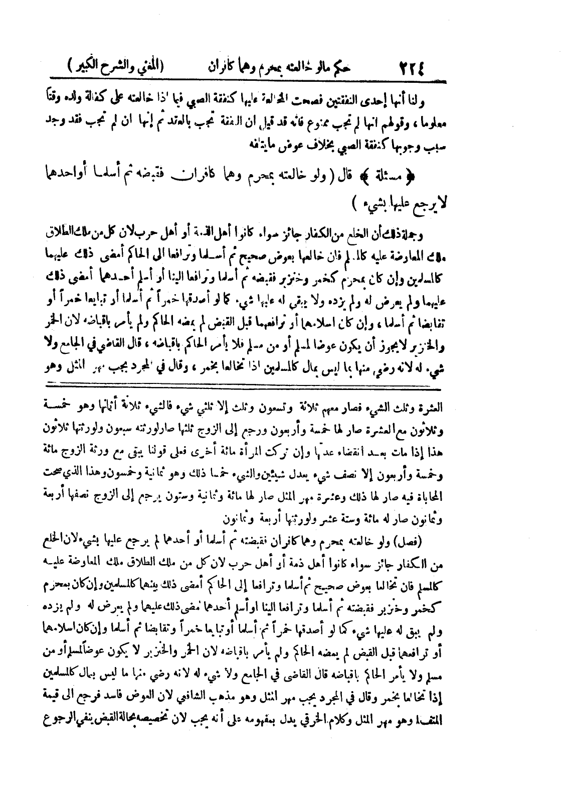العشرة وثلث الشئ فصار معهم ثلاثة وتسعون وثلث إلا ثلثي شئ فالشئ ثلاثة أثمانها وهو خمسة وثلاثون مع العشرة صار لها خمسة وأربعون ورجع الى الزوج ثلثها صار لورثته سبعون ولورثتها ثلاثون هذا إذا مات بعد انقضاء عدتها وإن تركت المرأة مائة أخرى فعلى قولنا يبقى مع ورثة الزوج مائة وخمسة وأربعون إلا نصف شئ يعدل شيئين والشئ خمساً ذلك وهو ثمانية وخمسون وهذا الذي صحت المحاباة فيه صار لها ذلك وعشرة مهر المثل صار لها مائة وثمانية وستون يرجع الى الزوج نصفها أربعة وثمانون صار له مائة وستة عشر ولورثتها أربعة وثمانون (فصل) ولو خالعته بمحرم وهما كافران فقبضته ثم أسلما أو أحدهما لم يرجع عليها بشئ لأن الخلع من الكفار جائز سواء كانوا أهل ذمة أو أهل حرب لأن من ملك الطلاق ملك المعاوضة عليه كالمسلم فإن تخالعا بعوض صحيح ثم أسلما وترافعا الى الحاكم أمضى ذلك بينهما كالمسلمين وإن كان بمحرم كخمر وخنزير فقبضته ثم أسلما وترافعا إلينا أو أسلم أحدهما امضى ذلك عليهما ولم يعرض له ولم يزده ولم يبق له عليها شئ كما لو أصدقها خمراً ثم أسلما أو تبايعا خمرا وتقابضا ثم أسلما وإن كان اسلامهما أو ترافعهما قبل القبض لم يمضه الحاكم ولم يأمر باقباضه لأن الخمر والخنزير لا يكون عوضاً لمسلم أو من مسلم ولا يأمر الحاكم باقباضه قال القاضي في الجامع ولا شئ له لأنه رضي منها ما ليس بمال كالمسلمين