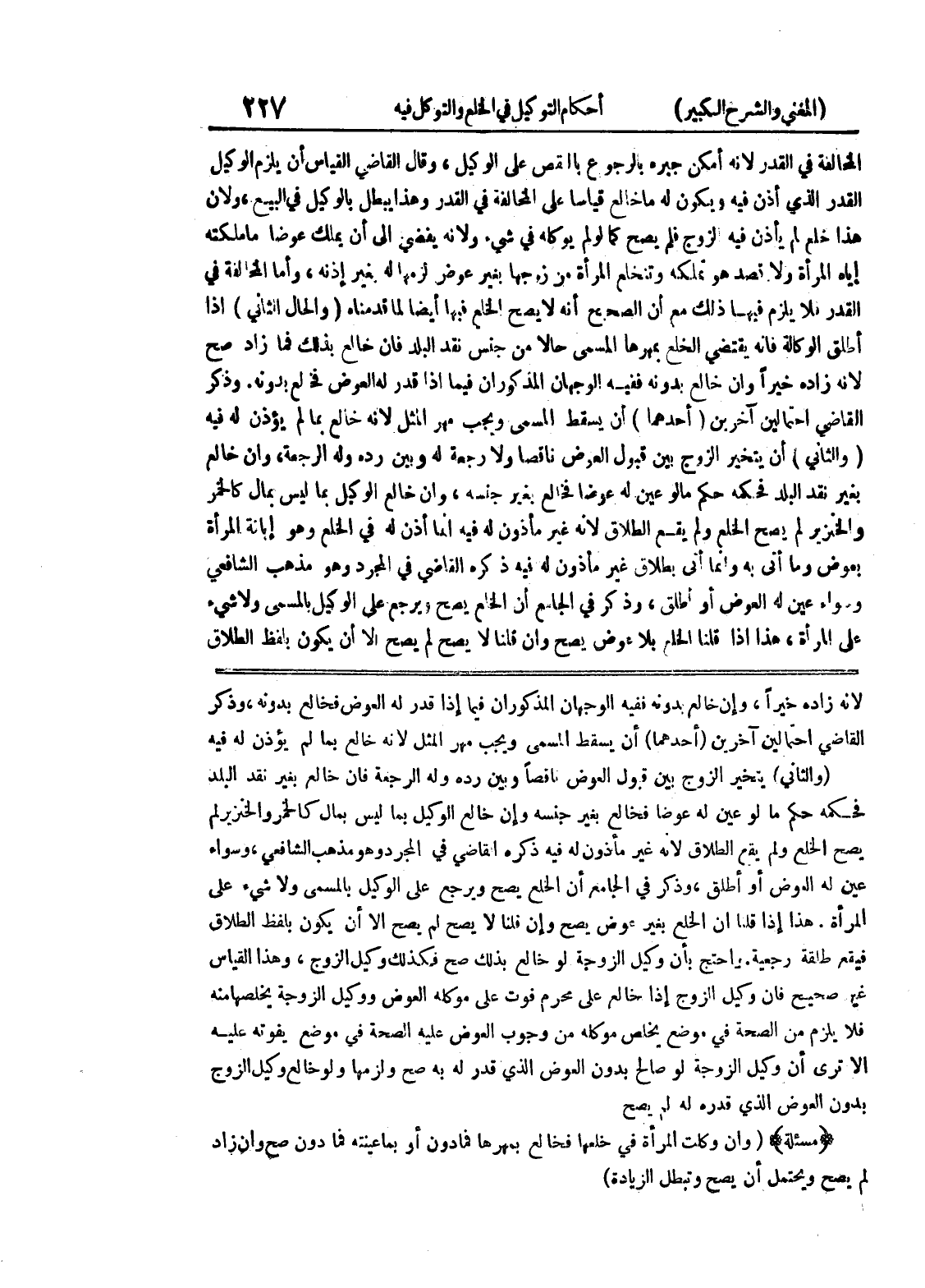 لأنه زاده خيراً، وإن خالع بدونه ففيه الوجهان المذكوران فيما إذا قدر له العوض فخالع بدونه، وذكر القاضي احتمالين آخرين (أحدهما) أن يسقط المسمى ويجب مهر المثل لأنه خالع بما لم يؤذن له فيه (والثاني) يتخير الزوج بين قبول العوض ناقصاً وبين رده وله الرجعة فإن خالع بغير نقد البلد فحكمه حكم ما لو عين له عوضاً فخالع بغير جنسه وإن خالع الوكيل بما ليس بمال كالخمر والخنزير لم يصح الخلع ولم يقع الطلاق لأنه غير مأذون له فيه ذكره القاضي في المجرد وهو مذهب الشافعي، وسواء عين له العوض أو أطلق، وذكر في الجامع أن الخلع يصح ويرجع على الوكيل بالمسمى ولا شئ على المرأة.