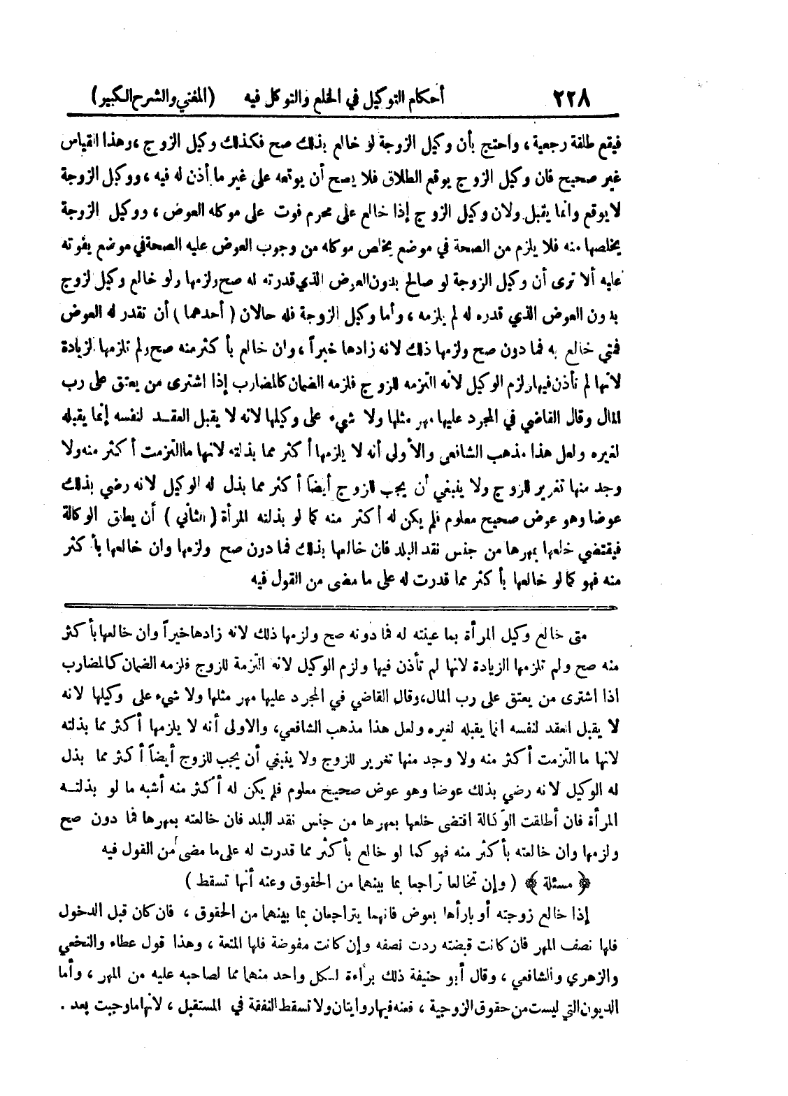 متى خالع وكيل المرأة بما عينته له فما دونه صح ولزمها ذلك لأنه زادها خيراً وإن خالعها بأكثر منه صح ولم تلزمها الزيادة لأنها لم تأذن فيها ولزم الوكيل لأنه التزمه للزوج فلزمه الضمان كالمضارب إذا اشترى من يعتق على رب المال، وقال القاضي في المجرد عليها مهر مثلها ولا شئ على وكيلها لأنه لا يقبل العقد لنفسه إنما يقبله لغيره ولعل هذا مذهب الشافعي، والأولى أنه لا يلزمها أكثر مما بذلته لأنها ما التزمت أكثر منه ولا وجد منها تغرير للزوج ولا ينبغي أن يجب للزوج أيضاً أكثر مما بذل له الوكيل لأنه رضي بذلك عوضاً وهو عوض صحيح معلوم فلم يكن له أكثر منه أشبه ما لو بذلته المرأة فإن أطلقت الوكالة اقتضى خلعها بمهرها من جنس نقد البلد فإن خالعته بمهرها فما دون صح ولزمها وإن خالعته باكثر منه فهو كما لو خالع بأكثر مما قدرت له على ما مضى من القول فيه * (مسألة) * (وان تخالعا تراجعا بما بينهما من الحقوق وعنه أنها تسقط) إذا خالع زوجته أو بارأها بعوض فإنهما يتراجعان بما بينهما من الحقوق، فإن كان قبل الدخول فلها نصف المهر فإن كانت قبضته ردت نصفه وإن كانت مفوضة فلها المتعة، وهذا قول عطاء والنخعي والزهري والشافعي، وقال أبو حنيفة ذلك براءة لكل واحد منهما مما لصاحبه عليه من المهر، وأما الديون التي ليست من حقوق الزوجية، فعنه فيها روايتان ولا تسقط النفقة في المستقبل، لأنها ما وجبت بعد.