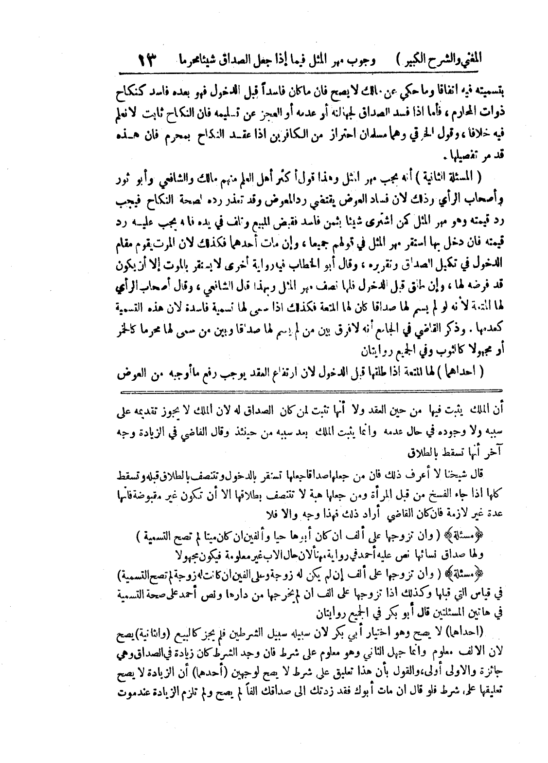 أن الملك يثبت فيها من حين العقد ولا أنها تثبت لمن كان الصداق له لأن الملك لا يجوز تقديمه على سببه ولا وجوده في حال عدمه وإنما يثبت الملك بعد سببه من حينئذ وقال القاضي في الزيادة وجه آخر أنها تسقط بالطلاق قال شيخنا لا أعرف ذلك فإن من جعلها صداقا جعلها تستقر بالدخول وتتنصف بالطلاق قبله وتسقط كلها إذا جاء الفسخ من قبل المرأة ومن جعلها هبة لا تتنصف بطلاقها إلا أن تكون غير مقبوضة فإنها عدة غير لازمة فإن كان القاضي أراد ذلك فهذا وجه وإلا فلا * (مسألة) * (وإن تزوجها على ألف إن كان أبوها حيا وألفين إن كان ميتا لم تصح التسمية) ولها صداق نسائها نص عليه أحمد في رواية مهنا لأن حال الأب غير معلومة فيكون مجهولاً * (مسألة) * (وإن تزوجها على ألف إن لم يكن له زوجة وعلى ألفين إن كانت له زوجة لم تصح التسمية) في قياس التي قبلها وكذلك إذا تزوجها على ألف إن لم يخرجها من دارها ونص أحمد على صحة التسمية في هاتين المسئلتين قال أبو بكر في الجميع روايتان (إحداهما) لا يصح وهو اختيار أبي بكر لأن سبيله سبيل الشرطين فلم يجز كالبيع (والثانية) يصح لأن الألف معلوم وإنما جهل الثاني وهو معلوم على شرط فإن وجد الشرط كان زيادة في الصداق وهي جائزة والأولى أولى، والقول بأن هذا تعليق على شرط لا يصح لوجهين (أحدهما) أن الزيادة لا يصح تعليقها على شرط فلو قال إن مات أبوك فقد زدتك إلى صداقك ألفاً لم يصح ولم تلزم الزيادة عند موت