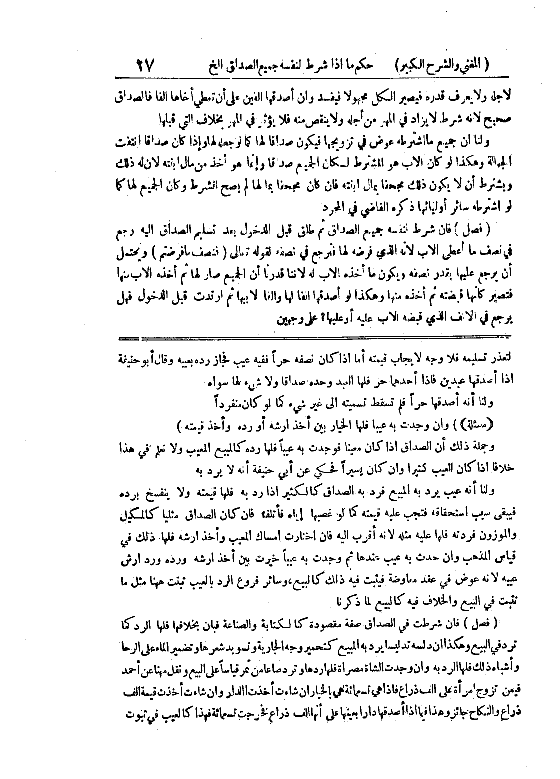 لتعذر تسليمه فلا وجه لإيجاب قيمته أما إذا كان نصفه حراً ففيه عيب فجاز رده بعيبه وقال أبو حنيفة إذا أصدقها عبدين فإذا أحدهما حر فلها العبد وحده صداقاً ولا شئ لها سواه ولنا أنه أصدقها حراً فلم تسقط تسميته إلى غير شئ كما لو كان منفرداً * (مسألة) * وإن وجدت به عيبا فلها الخيار بين أخذ أرشه أو رده وأخذ قيمته) وجملة ذلك أن الصداق إذا كان معينا فوجدت به عيباً فلها رده كالمبيع المعيب ولا نعلم في هذا خلافا إذا كان العيب كثيراً وإن كان يسيراً فحكي عن أبي حنيفة أنه لا يرد به ولنا أنه عيب يرد به المبيع فرد به الصداق كالكثير إذا رد به فلها قيمته ولا ينفسخ برده فيبقى سبب استحقاقه فتجب عليه قيمته كما لو غصبها إياه فأتلفه فإن كان الصداق مثلياً كالمكيل والموزون فردته فلها عليه مثله لأنه أقرب إليه فإن اختارت إمساك المعيب وأخذ أرشه فلها ذلك في قياس المذهب وإن حدث به عيب عندها ثم وجدت به عيباً خيرت بين أخذ أرشه ورده ورد أرش عيبه لأنه عوض في عقد معاوضة فيثبت فيه ذلك كالبيع، وسائر فروع الرد بالعيب ثبتت ههنا مثل ما تثبت في البيع والخلاف فيه كالبيع لما ذكرنا (فصل) فإن شرطت في الصداق صفة مقصودة كالكتابة والصناعة فبان بخلافها فلها الرد كما ترد في البيع وهكذا إن دلسه تدليسا يرد به المبيع كتحمير وجه الجارية وتسويد شعرها وتضمير الماء على الرحا وأشباه ذلك فلها الرد به وإن وجدت الشاة مصراة فلها ردها وترد صاعا من تمر قياساً على البيع ونقل مهنا عن أحمد فيمن تزوج امرأة على ألف ذراع فإذا هي تسعمائة هي بالخيار إن شاءت أخذت الدار وإن شاءت أخذت قيمة ألف ذراع والنكاح جائز وهذا فيما إذا أصدقها دارا بعينها على أنها ألف ذراع فخرجت تسعمائة فهذا كالعيب في ثبوت