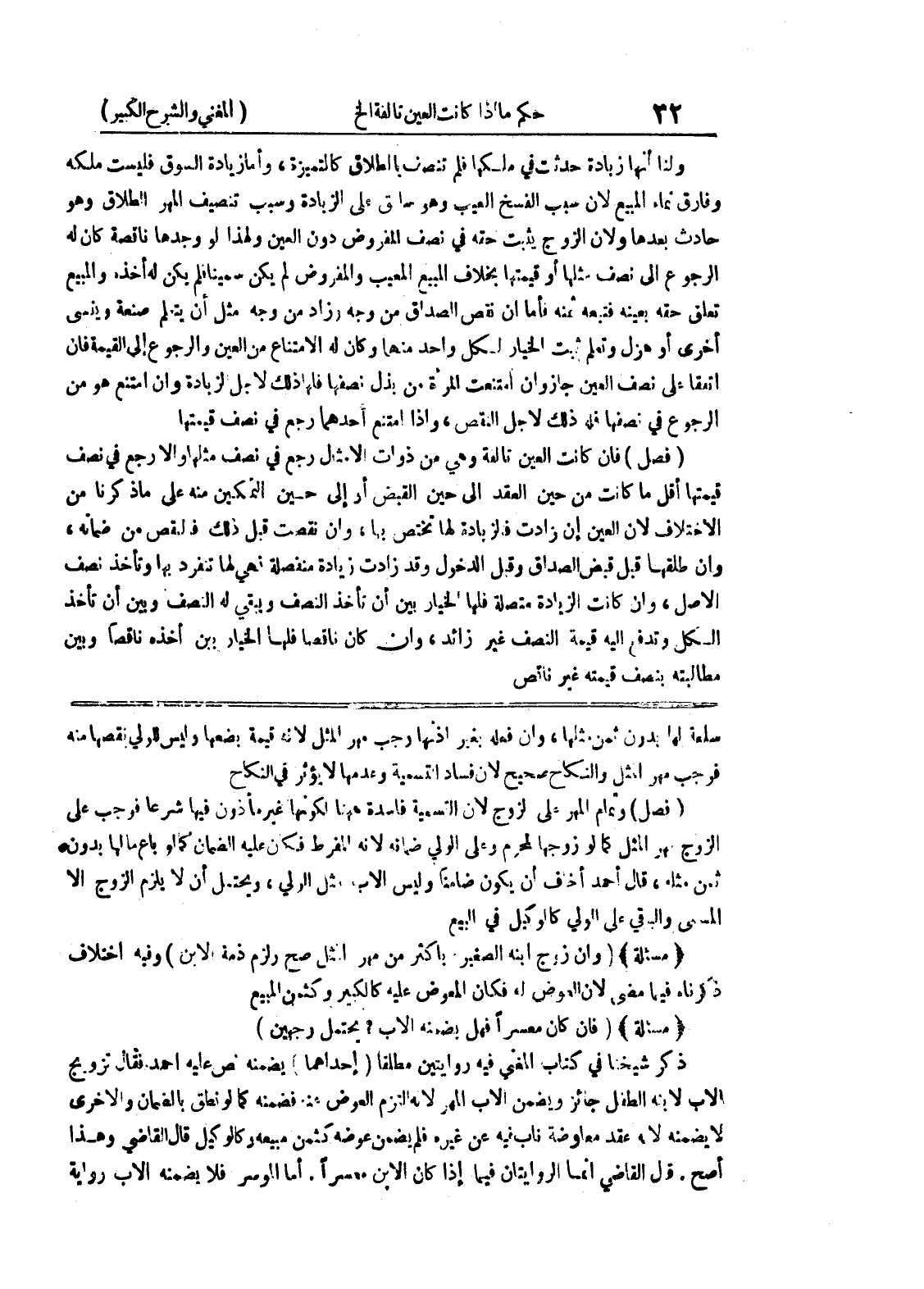 سلعة لها بدون ثمن مثلها، وإن فعله بغير إذنها وجب مهر المثل لأنه قيمة بضعها وليس للولي نقصها منه فوجب مهر المثل والنكاح صحيح لأن فساد التسمية وعدمها لا يؤثر في النكاح (فصل) وتمام المهر على لزوج لأن التسمية فاسدة ههنا لكونها غير مأذون فيها شرعاً فوجب على الزوج مهر المثل كما لو زوجها لمحرم وعلى الولي ضمائه لأنه المفرط فكان عليه الضمان كما لو باع مالها بدون ثمن مثله، قال أحمد أخاف أن يكون ضامناً وليس الأب مثل الولي، ويحتمل أن لا يلزم الزوج إلا المسمى والباقي على الولي كالوكيل في البيع * (مسألة) * (وإن زوج ابنه الصغير بأكثر من مهر المثل صح ولزم ذمة الابن) وفيه اختلاف ذكرناه فيما مضى لأن العوض له فكان المعوض عليه كالكبير وكثمن المبيع * (مسألة) * (فإن كان معسراً فهل يضمنه الأب؟ يحتمل وجهين) ذكر شيخنا في كتاب المغني فيه روايتين مطلقاً (إحداهما) يضمنه نص عليه أحمد فقال تزويج الأب لابنه الطفل جائز ويضمن الأب المهر لأنه التزم العوض عنه فضمنه كما لو نطق بالضمان والاخرى