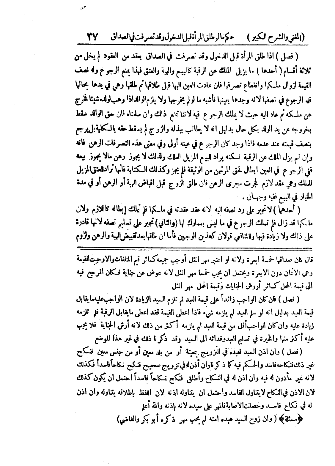 وهي الأثمان دون الأبعرة ويحتمل أن يجب خمساً مهر المثل لأنه عوض عن جناية فكان المرجع فيه الى قيمة المحل كسائر أروش الجنايات وقيمة المحل مهر المثل (فصل) فإن كان الواجب زائداً على قيمة العبد لم تلزم السيد الزيادة لأن الواجب عليه ما يقابل قيمة العبد بدليل أنه لو سلم العبد لم يلزمه شئ فإذا أعطى القيمة فقد أعطى ما يقابل الرقبة فلم تلزمه زيادة عليه وإن كان الواجب أقل من قيمة العبد لم يلزمه أكثر من ذلك لأنه أرش الجناية فلا يجب عليه أكثر منها والخيرة في تسليم العبد وفدائه الى السيد وقد ذكرنا ذلك في غير هذا الموضع (فصل) وإن إذن السيد لعبده في التزويج بمعينة أو من بلد معين أو من جنس معين فنكح غير ذلك فنكاحه فاسد والحكم فيه كما ذكرنا وإن أذن له في تزويج صحيح فنكح نكاحاً فاسداً فكذلك لأنه غير مأذون له فيه وإن أذن له في النكاح وأطلق فنكح نكاحاً فاسداً احتمل أن يكون كذلك لأن الاذن في النكاح لا يتناول الفاسد واحتمل أن يتناوله إذنه لأن اللفظ بإطلاقه يتناوله وإن أذن له في نكاح فاسد وحصلت الإصابة فالمهر على سيدة لأنه بإذنه والله أعلم * (مسألة) * (وإن زوج السيد عبده أمته لم يحب مهر ذكره أبو بكر والقاضي)